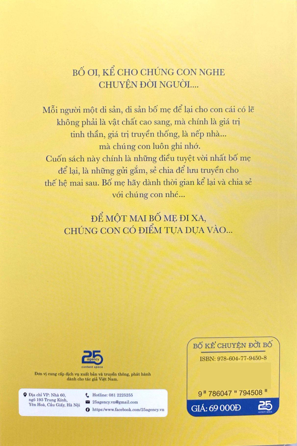 Cuộc đời là hữu hạn, nhưng tình yêu và những câu chuyện bố mẹ để lại là mãi mãi. Tặng họ cuốn sách này là một cách để bạn nói rằng: “Con luôn trân quý thời gian bên bố mẹ và mong được lưu giữ tất cả những gì thuộc về bố mẹ trong trái tim con.”