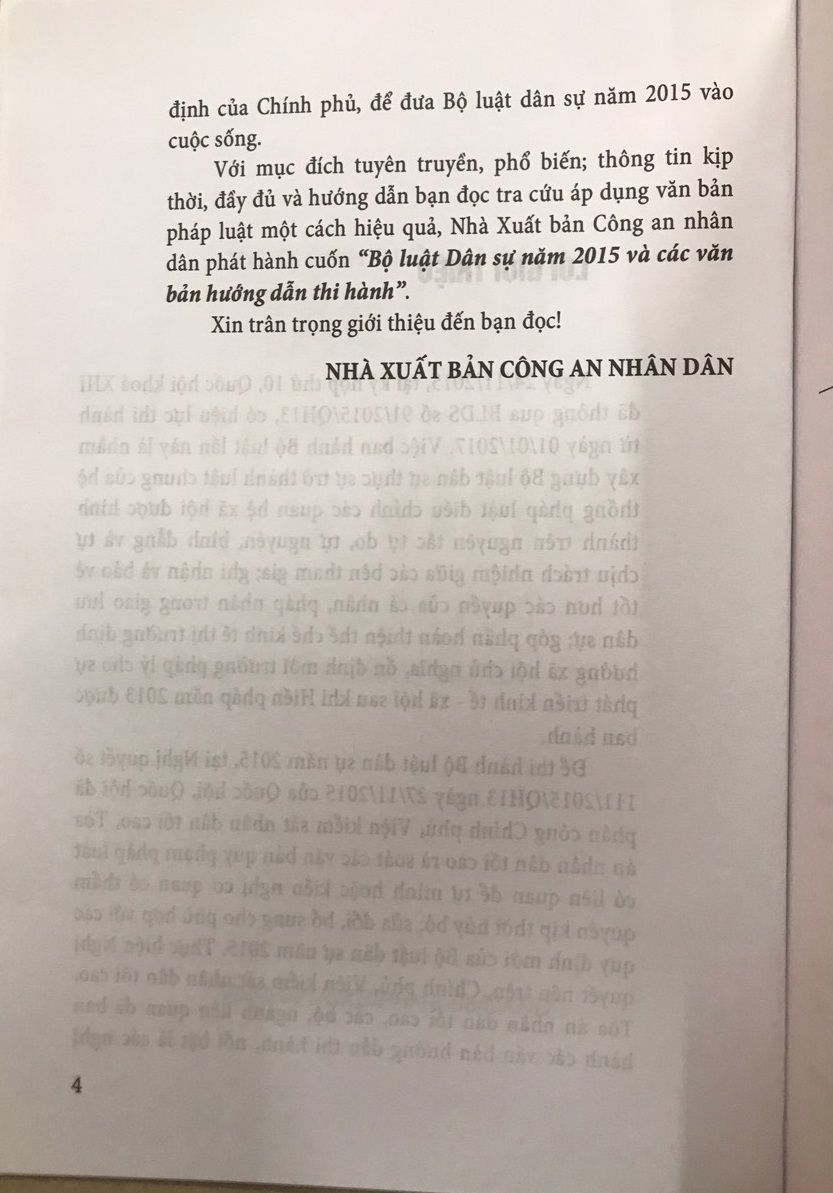 Với mục đích tuyên truyền, phổ biến, thông tin kịp thời, đầy đủ và hướng dẫn bạn đọc tra cứu áp dụng văn bản pháp luật một cách hiệu quả, Nhà xuất bản Công an Nhân dân phát hành cuốn sách: "Bộ luật dân sự năm 2015 và Các văn bản hướng dẫn thi hành"
