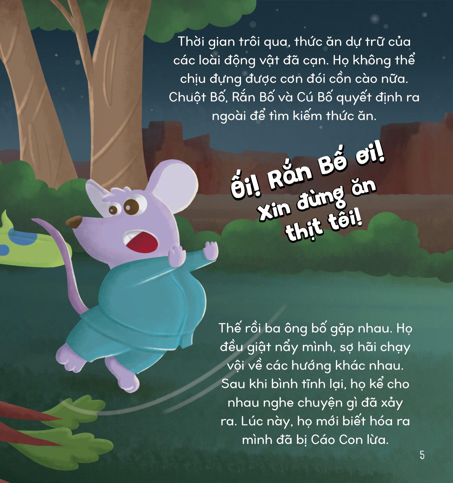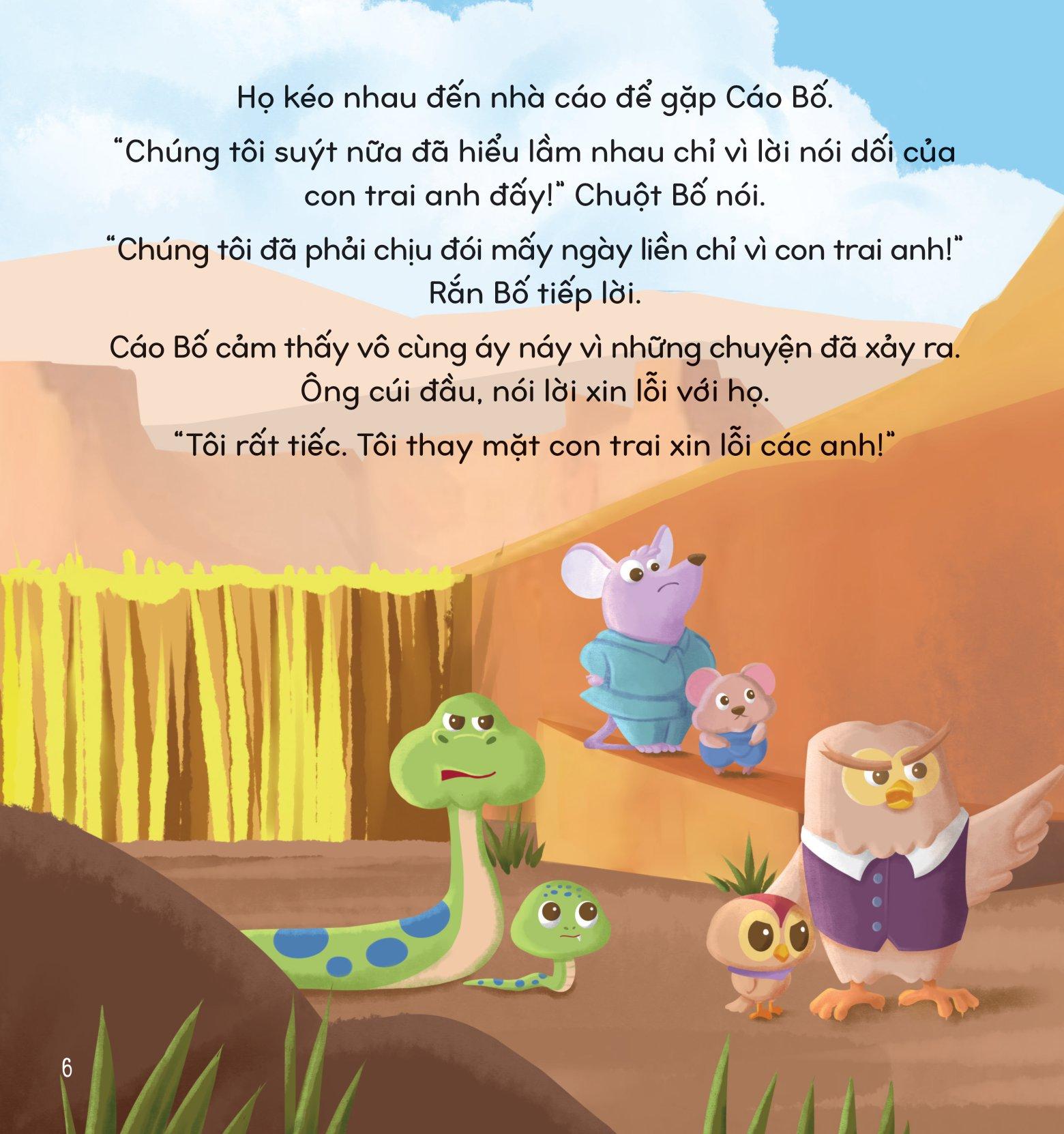 Một hôm, Cáo Con nghịch ngợm nói dối các loài động vật khác rằng nếu họ ra khỏi tổ thì sẽ gặp nguy hiểm. Thế là họ không dám đi đâu, phải chịu đói biết bao ngày. Cuối cùng, vì không thể chịu nổi nữa, họ mới ra ngoài kiếm ăn và phát hiện ra tất cả chỉ là trò lừa gạt của Cáo Con. Họ bèn kéo đến trách mắng Cáo Bố. Cáo Bố phải làm thế nào để giúp con mình sửa sai và tạ lỗi với họ đây? Chúng mình hãy cùng theo dõi câu chuyện thú vị và đầy cảm động này để tìm ra câu trả lời nhé! Thông qua câu chuyện, em sẽ còn học hỏi được nhiều đức tính tốt đẹp từ Cáo Bố nữa đấy.