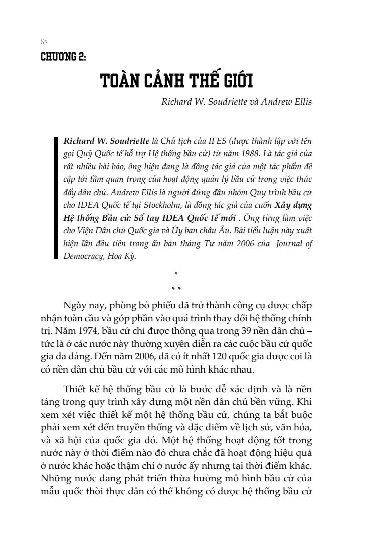 Cuốn sách được các nhà khoa học chính trị xuất sắc nhất thế giới đã và đang giảng dạy từ nhiều trường đại học danh tiếng thực hiện trong suốt 16 năm bao gồm lấy dữ liệu, tổng hợp và phân tích. Các bài luận này đồng thời là bản đánh giá quá trình thiết kế bầu cử tại các nước đang trong quá trình chuyển đổi do Tạp chí Dân Chủ thực hiện.
