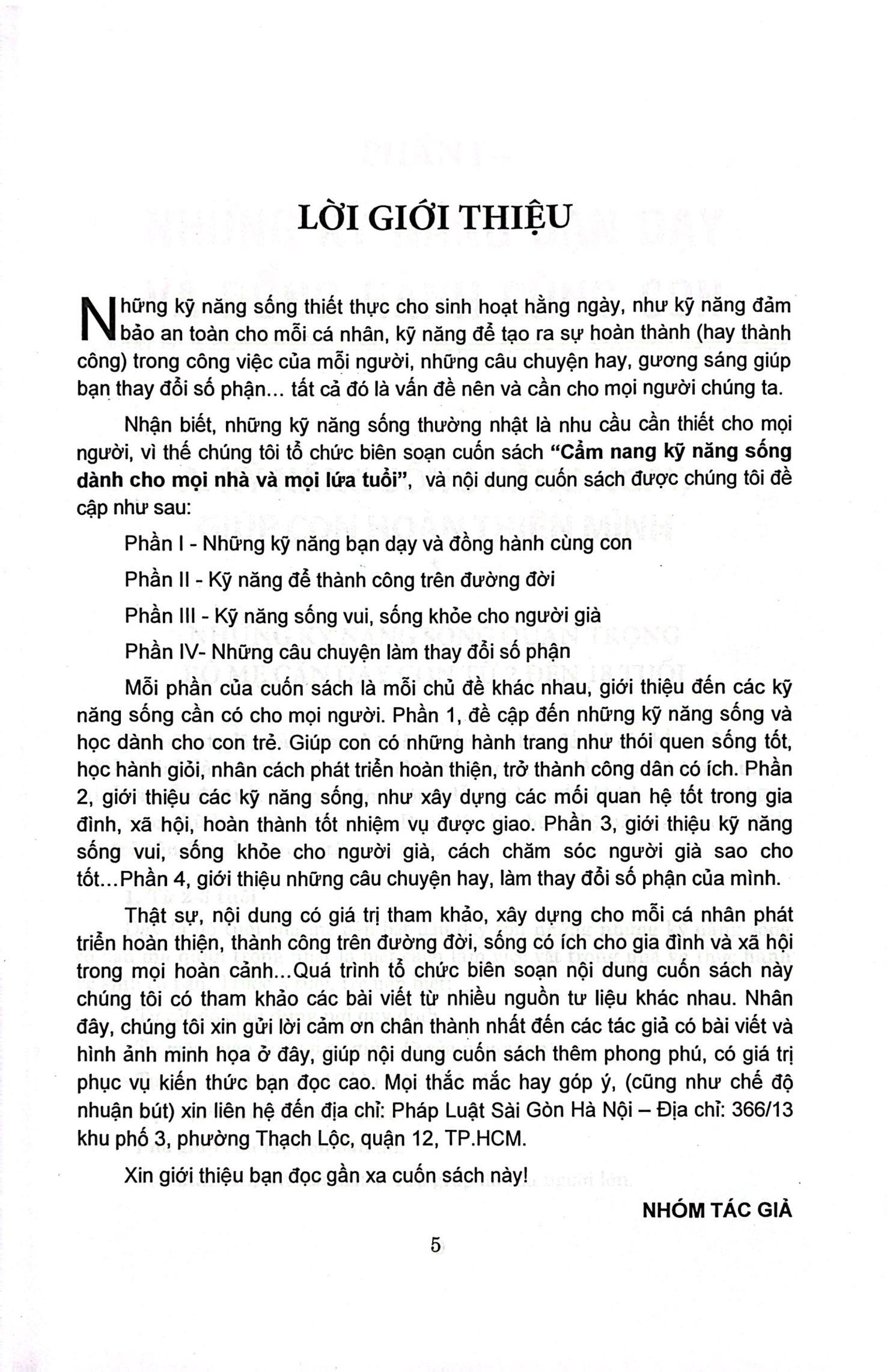 Cuốn sách đem đến cho bạn đọc những kỹ năng sống thiết thực cho sinh hoạt hằng ngày, như kỹ năng đảm bảo an toàn cho mỗi cá nhân, kỹ năng để tạo ra sự hoàn thành (hay thành công) trong công việc của mỗi người, những câu chuyện hay, gương sáng giúp bạn thay đổi số phận... tất cả đó là vấn đề nên và cần cho mọi người chúng ta.