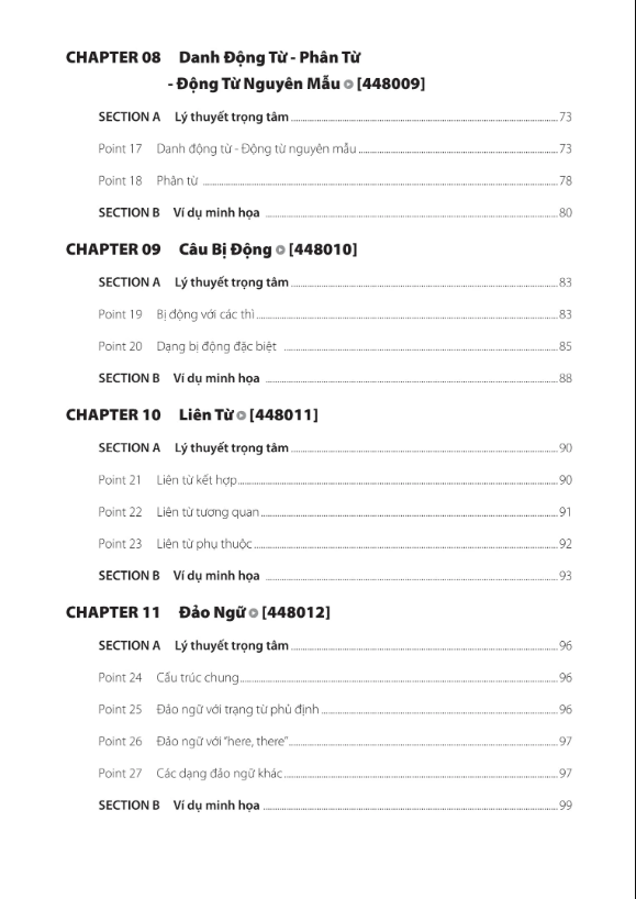 (2) PART 02 - Ngữ pháp trọng tâm và một số phạm trù nâng cao: Gồm 15 chủ điểm ngữ pháp trọng tâm và một số phạm trù nâng cao trong chương trình học, với hệ thống lý thuyết - ví dụ minh họa - các dạng bài tập chuẩn format đề thi