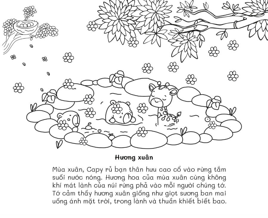 Mỗi trang trong cuốn sách đều là một tác phẩm nghệ thuật thu nhỏ, với chủ đề chính về Capybaras và những khoảnh khắc vui vẻ. Những hình vẽ này được thiết kế một cách cẩn thận, tạo nên một không gian yên bình, ấm áp và dịu dàng.