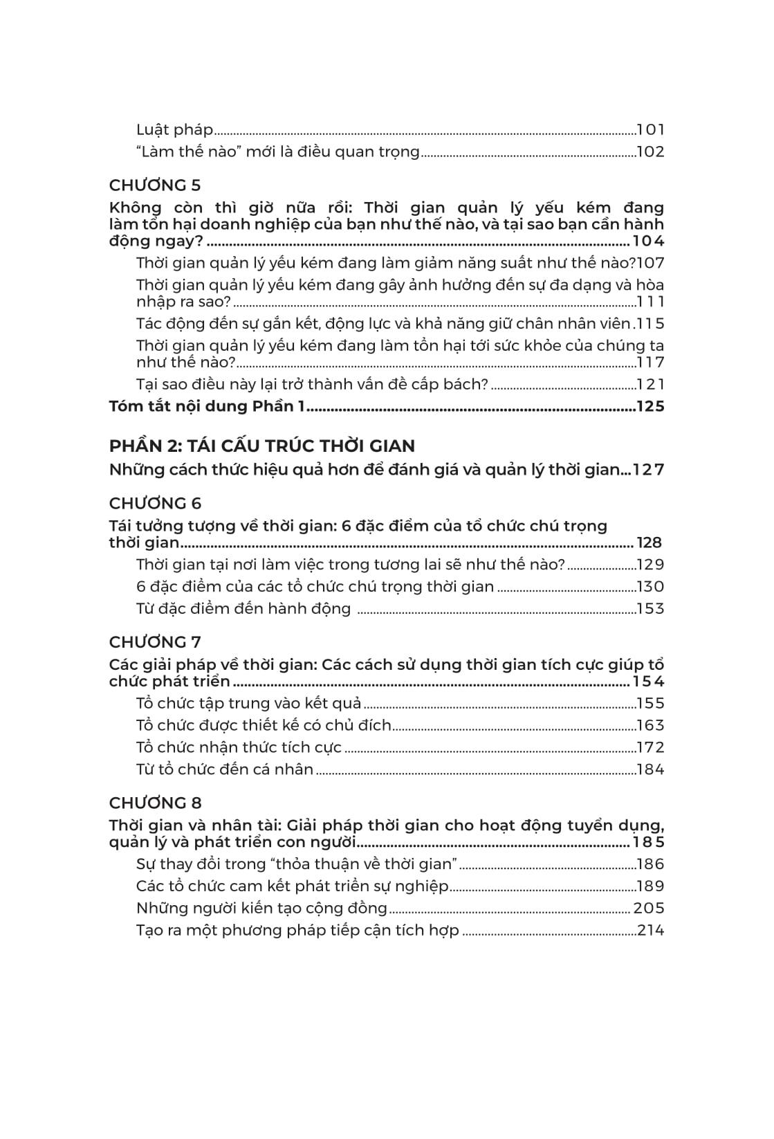 Sang phần thứ hai, “Tái cấu trúc thời gian”, cuốn sách chuyển từ chẩn đoán sang hành động. Helen Beedham vẽ nên bức tranh về một tổ chức “chủ trọng thời gian” – nơi các quyết định không xoay quanh số giờ làm việc mà tập trung vào kết quả, nơi công việc được thiết kế có chủ đích và nhân viên được trao quyền tự chủ.