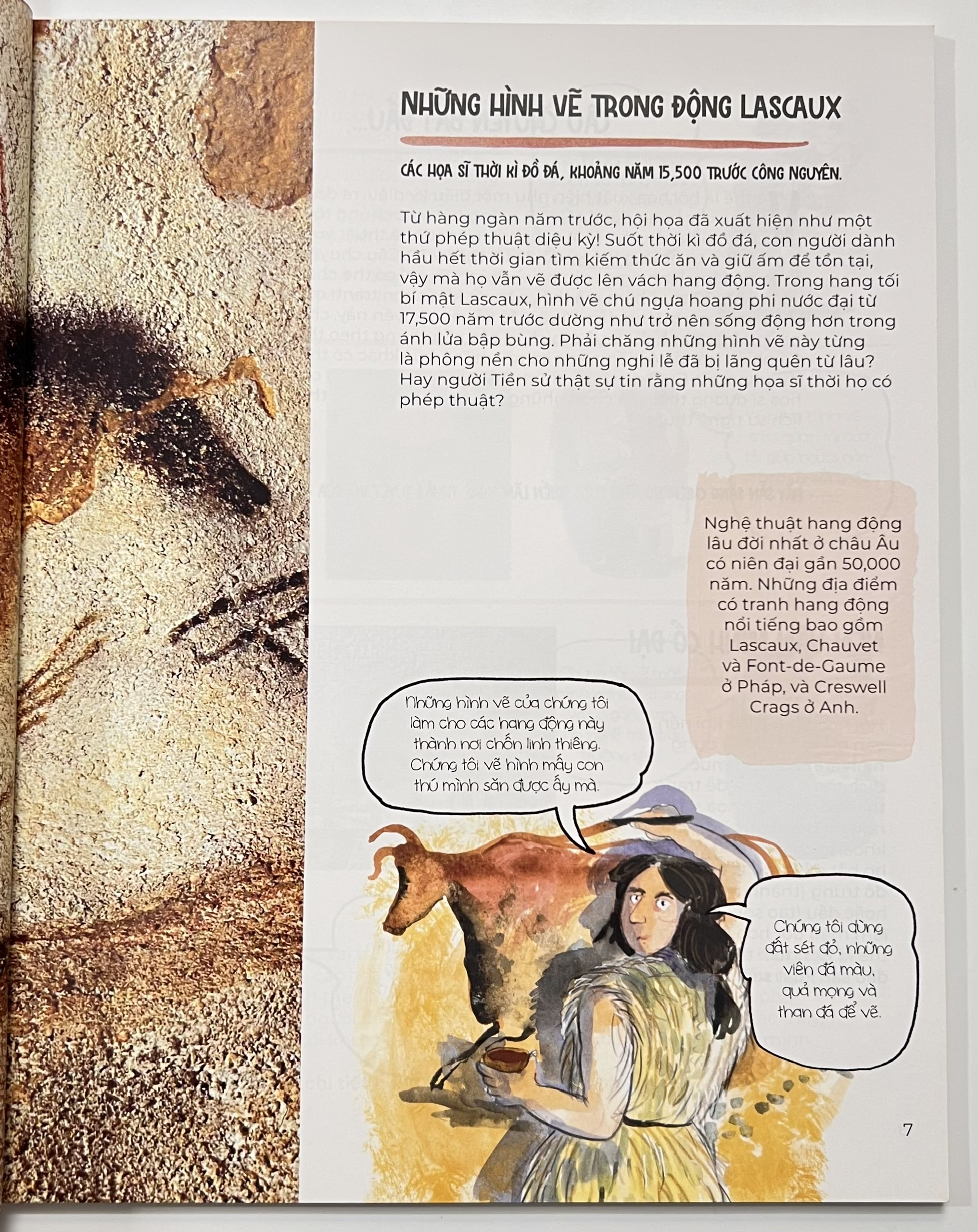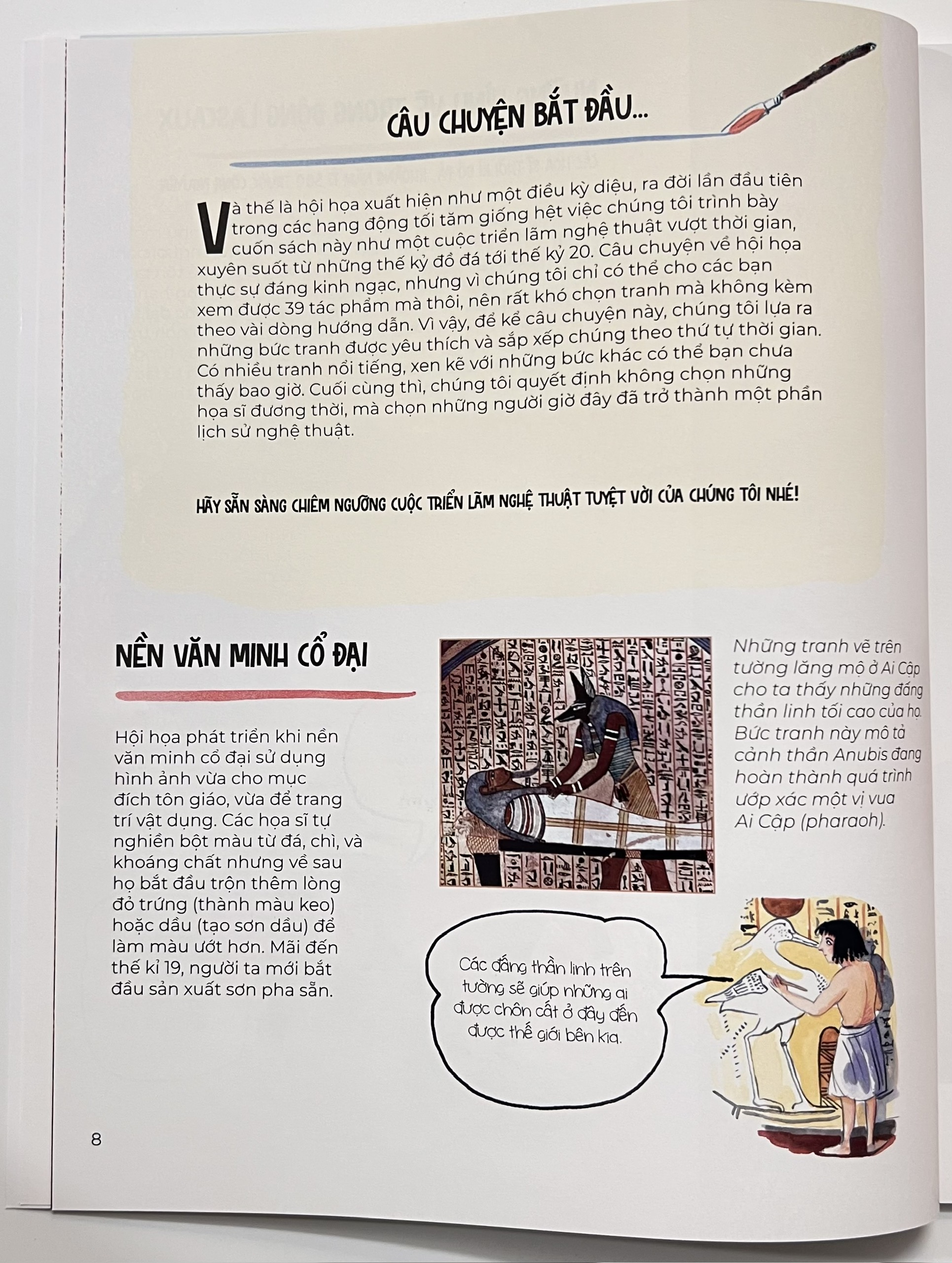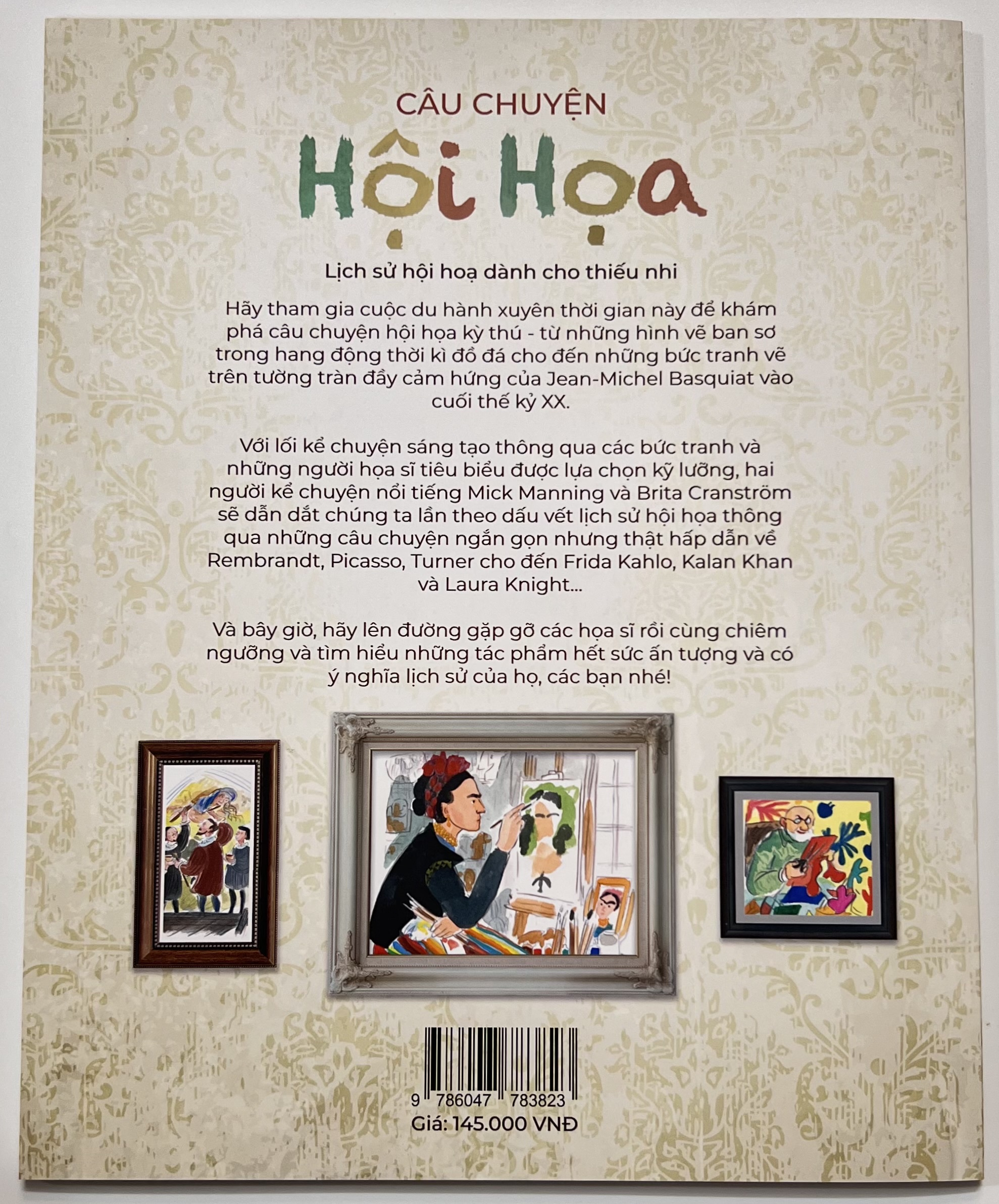 "Câu chuyện hội họa: Lịch sử hội họa dành cho thiếu nhi" đưa độc giả nhỏ tuổi vào cuộc hành trình nghệ thuật từ nghệ thuật hang động thời tiền sử đến tranh vẽ graffiti đương đại. Cuốn sách minh họa phong phú này bao gồm 39 tác phẩm nghệ thuật quan trọng, từ các bức vẽ hang động cổ xưa cho tới các tác phẩm mang tính biểu tượng của Botticelli, Velázquez, Dalí, Picasso, Kahlo và Basquiat. Được thiết kế để thu hút trẻ em, cuốn sách cho thấy tác phẩm của họa sĩ, kèm theo hình hoạt hình và lời nhắc tương tác để kích thích trí tò mò và khả năng quan sát.