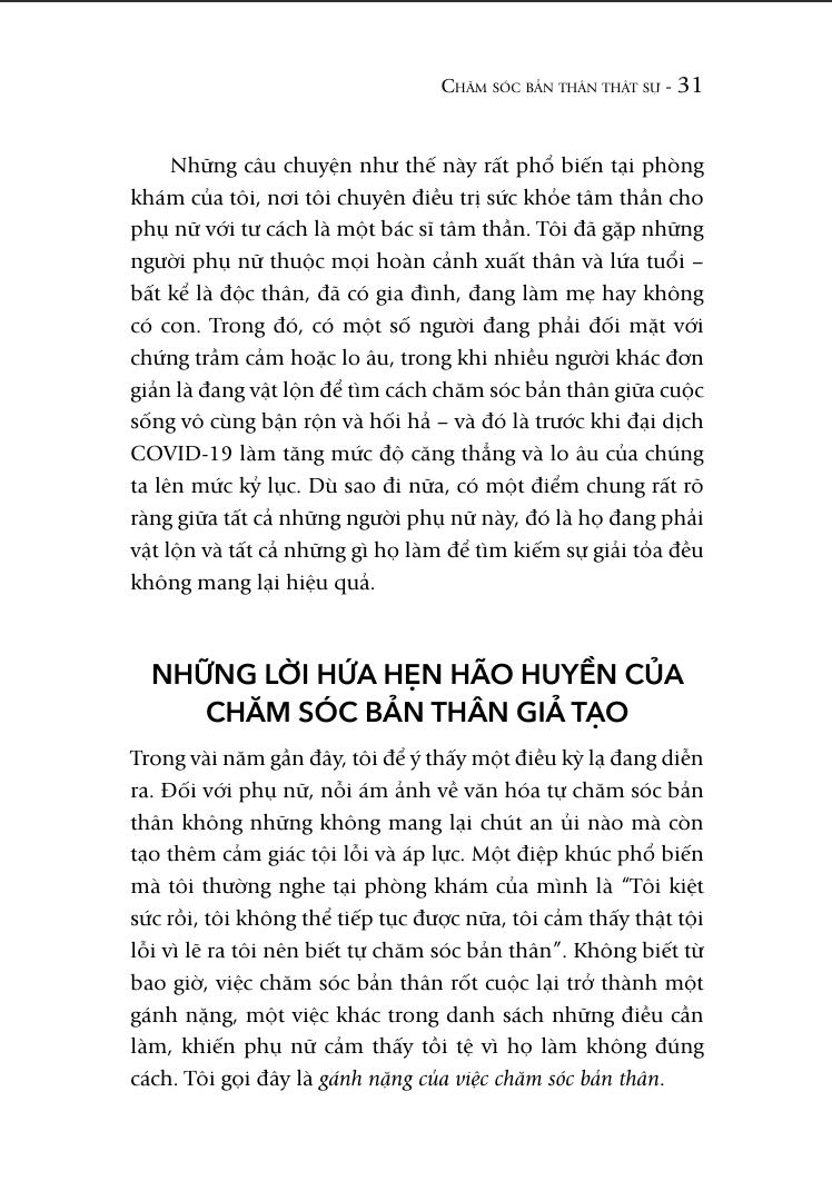 Nếu bạn từng cảm thấy mệt mỏi với những lời khuyên sáo rỗng về chăm sóc bản thân, nếu bạn muốn tìm một cách tiếp cận thật sự hiệu quả từ một chuyên gia nhiều kinh nghiệm, “Chăm sóc bản thân thật sự” là quyển sách dành cho bạn. Đọc quyển sách này, bạn sẽ học được cách yêu thương bản thân thay vì lúc nào cũng chạy theo những tiêu chuẩn do xã hội áp đặt.