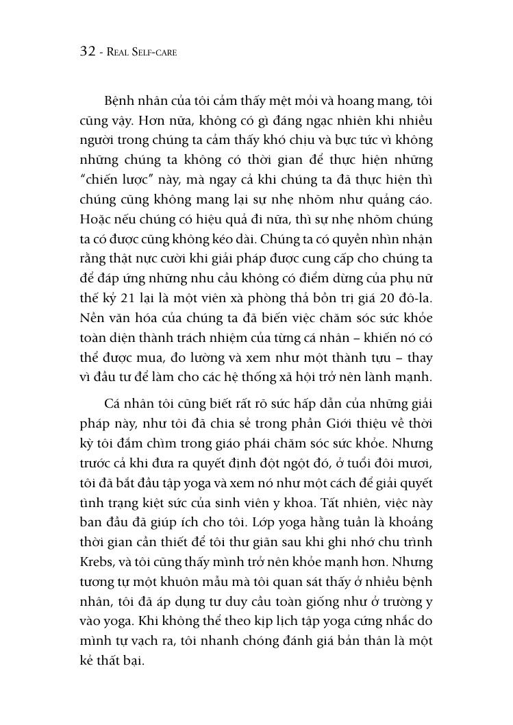 Đồng thời, Lakshmin cũng cung cấp cho người đọc một góc nhìn hoàn toàn khác về chăm sóc bản thân, theo đó chăm sóc bản thân thực thụ không nằm ở những món đồ bạn mua hay những việc bạn làm, mà ở cách bạn đưa ra các quyết định quan trọng để bảo vệ sức khỏe tinh thần và thể chất của chính m.ình.