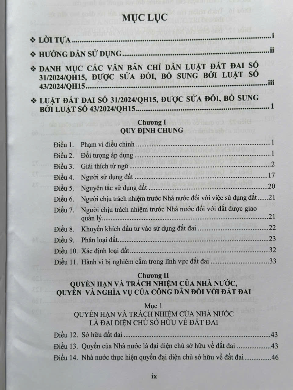 - Cuốn sách được biên soạn chỉ dẫn theo từng điều luật. Nội dung của Luật Đất đai số 31/2024/QH15 được sửa đổi, bổ sung bởi Luật số 43/2024/QH15 được trình bày với kiểu chữ không in nghiêng. Nội dung chỉ dẫn được trình bày liền kề sau từng điều luật tương ứng với kiểu chữ in nghiêng.