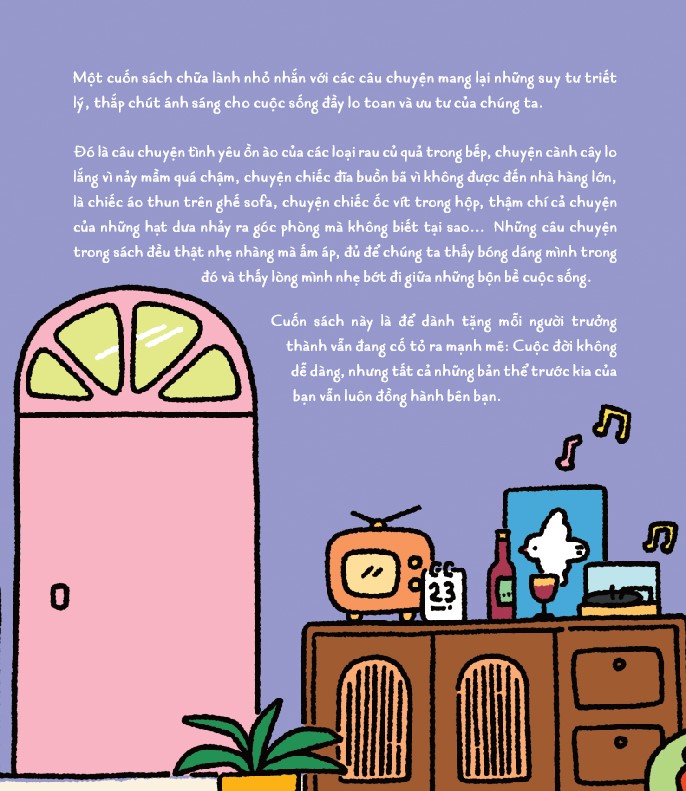 Đó là câu chuyện tình yêu ồn ào của các loại rau củ quả trong bếp, chuyện cành cây lo lắng vì nảy mầm quá chậm, chuyện chiếc đĩa buồn bã vì không được đến nhà hàng lớn, là chiếc áo thun trên ghế sofa, chuyện chiếc ốc vít trong hộp, thậm chí cả chuyện của những hạt dưa nhảy ra góc phòng mà không biết tại sao... Những câu chuyện trong sách đều thật nhẹ nhàng mà ấm áp, đủ để chúng ta thấy bóng dáng mình trong đó và thấy lòng mình nhẹ bớt đi giữa những bộn bề cuộc sống.