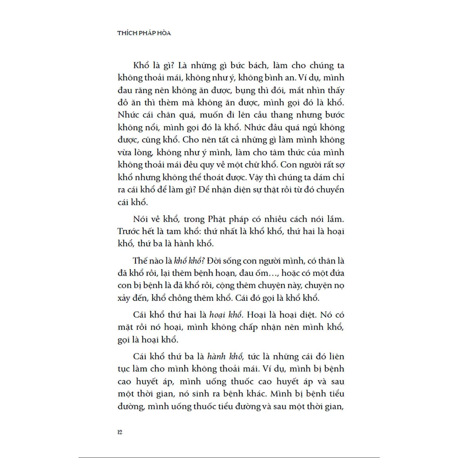 - Về tác giả: Thầy Thích Pháp Hòa sinh năm 1974 tại Cần Thơ, trong một gia đình có hai con trai và thầy là con trưởng. Cơ duyên của thầy với đạo Phật đã sớm bộc lộ từ khi thầy còn rất nhỏ. Vào năm bảy tuổi, thầy đòi mẹ dẫn vào một tịnh xá xin quy y và phát nguyện ăn chay, tụng kinh, thờ Phật. Tâm niệm xuất gia trong thầy cứ thế mỗi ngày một lớn. Năm mười hai tuổi, thầy và em trai cùng với mẹ sang Canada để đoàn tụ với cha của thầy. Khi đặt chân đến thành phố Edmonton (Canada), dù đối mặt với nhiều trở ngại, tâm bồ đề của thầy chẳng những không thối chuyển mà càng được củng cố mạnh mẽ hơn. Năm mười lăm tuổi, thầy chính thức xuất gia. Khi đó, tu viện Trúc Lâm tại Edmonton còn rất sơ khai. Năm 1994, khi vừa tròn hai mươi tuổi, thầy được vị bổn sư gửi sang Làng Mai (Pháp) để thọ giới tỳ-kheo và đã được thiền sư Thích Nhất Hạnh trực tiếp truyền giới trong đại giới đàn Hương Tích. Tuy thời gian lưu lại tại Làng Mai ngắn ngủi (chỉ trong vòng một tháng) nhưng thầy đã tiếp nhận và học hỏi được rất nhiều. Từ đó, thầy có thể dung hòa những hình thức tu tập mới vào truyền thống mà thầy đang theo để ngày càng tăng tiến trong đạo. Sau khi nhận truyền đăng từ thiền sư Thích Nhất Hạnh vào năm 1999, thầy lại trở về Canada tiếp tục con đường hoằng pháp của mình. Đến năm 20, sau một thời gian tu tập và giảng pháp, thầy được vị bổn sư tin cậy giao phó vai trò trụ trì Tu viện Trúc Lâm (tỉnh Alberta, Canada). Năm 20, sau khi tu viện Tây Thiên được hoàn thành, thầy đảm nhiệm thêm trọng trách trụ trì tu viện Tây Thiên. Với phong cách giản dị, gần gũi, khiêm cung và khả năng chuyển tải Phật pháp thâm sâu thành những cách thực hành gần gũi trong đời sống, thầy Thích Pháp Hòa nhận được sự yêu mến của đông đảo đại chúng thông qua những bài giảng pháp trên YouTube. Thầy là một minh chứng cho thấy rằng những vị chân tu vẫn có thể chinh phục lòng người theo cách “hữu xạ tự nhiên hương”. Thông tin sách: