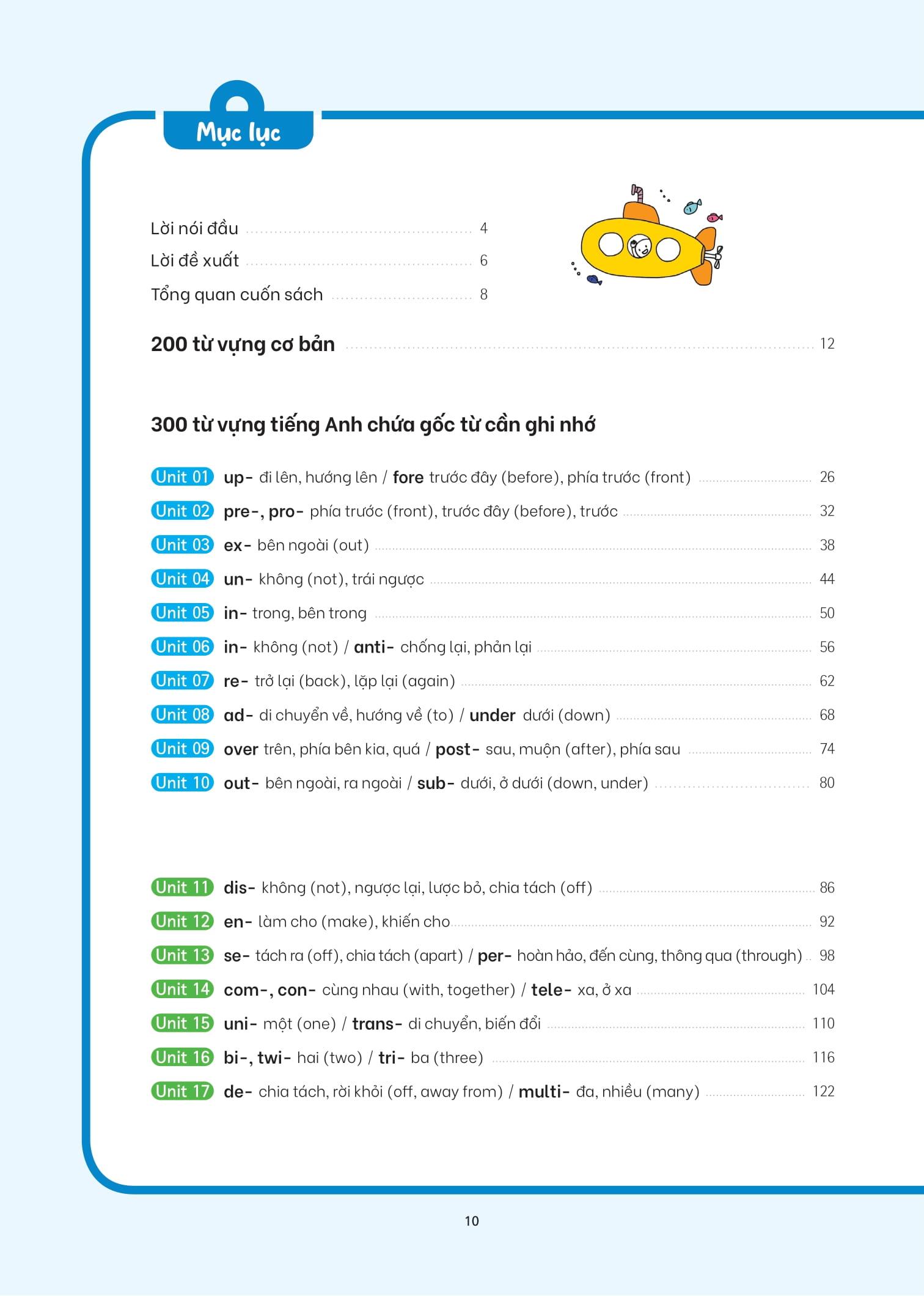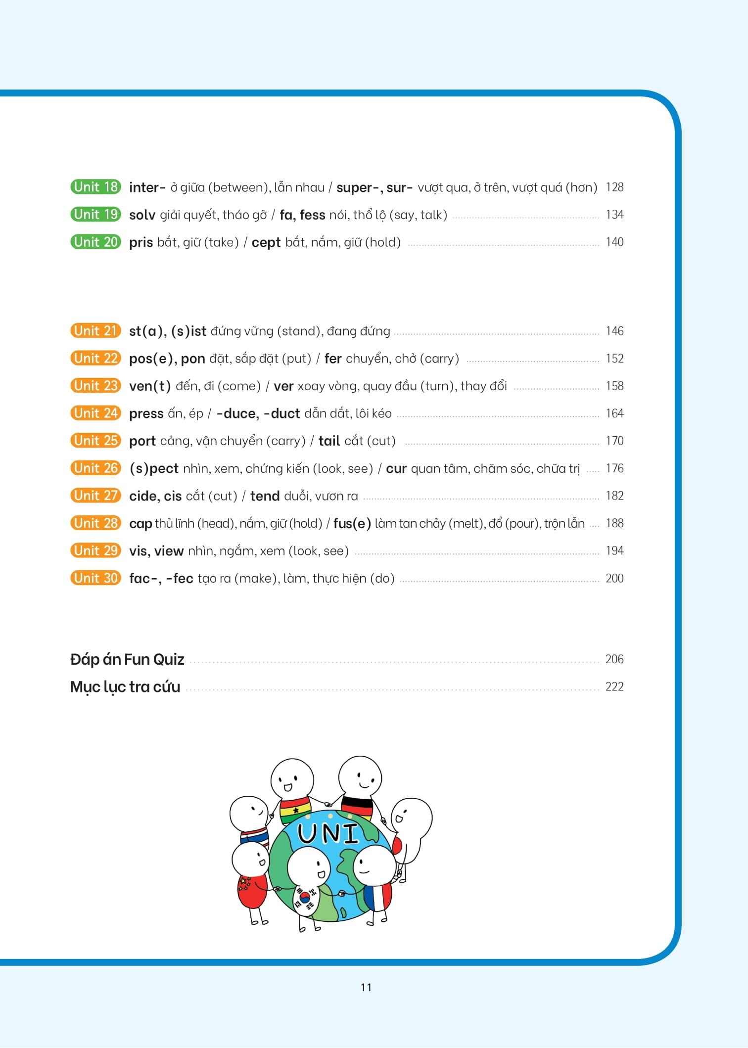 - Học từ vựng theo “gốc” – nắm chắc bản chất từ: Sách không chỉ đưa ra nghĩa mà phân tích chi tiết từng từ theo gốc – tiền tố – hậu tố, giúp bạn hiểu sâu và nhớ lâu, từ đó dễ dàng đoán nghĩa các từ mới liên quan mà không cần tra từ điển.