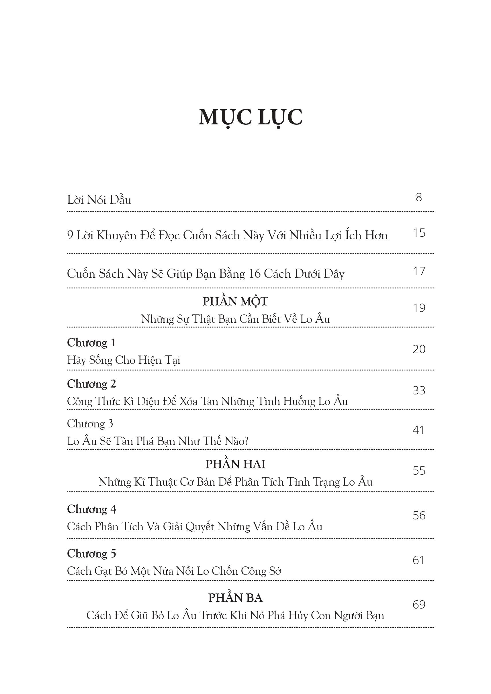 - QUẲNG GÁNH LO ĐI & VUI SỐNG Cuốn sách bao gồm 10 phần khác nhau, với rất nhiều những kinh nghiệm và các lời khuyên từ tác giả cũng như những người đi trước, giúp bạn có thể nhận thức được những điều đúng đắn nhất. Chi tiết Phần 1. Những sự thật bạn cần biết về lo âu Phần 2. Những kĩ thuật cơ bản để phân tích tình trạng lo âu Phần 3. Cách để giũ ỏ âu lo trước khi nó phá huỷ con người Phần 4. 7 cách vun đắp mảnh đất tinh thần để bạn trở nên vui vẻ và hạnh phúc hơn mỗi ngày Phần 5. Nguyên tắc vàng để xoá bỏ lo âu Phần 6. Cách chống lại lo âu khi bị chỉ trích Phần 7. Mệt mỏi dần tan biến - Tinh thần lên đỉnh cao Phần 8. Tìm việc đúng ý gặt hái thành công Phần 9. Cách giảm bớt nỗ lo tài chính Phần 10. Cách để chiến đấu với lo lắng MỘT SỐ HÌNH ẢNH NỘI DUNG THAM KHẢO CAM KẾT