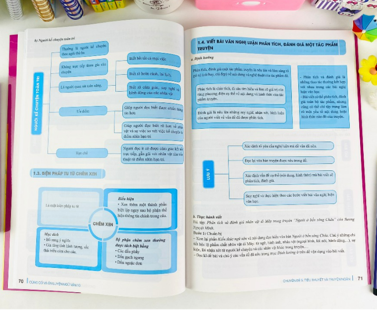 - Thứ ba, Phần đáp án của các bài tập tự luyện và đề thi: Nhóm tác giả gợi ý cách làm và trả lời câu hỏi, một số bài được làm mẫu, một số bài gợi mở các hướng giải quyết cho học sinh. Như vậy, cuốn sách giúp học sinh tiếp nhận tri thức một cách chủ động qua việc đọc, tóm tắt, ôn luyện kiến thức, thực hành luyện tập thông qua các bài rèn luyện và phát triển kĩ năng đọc và viết.