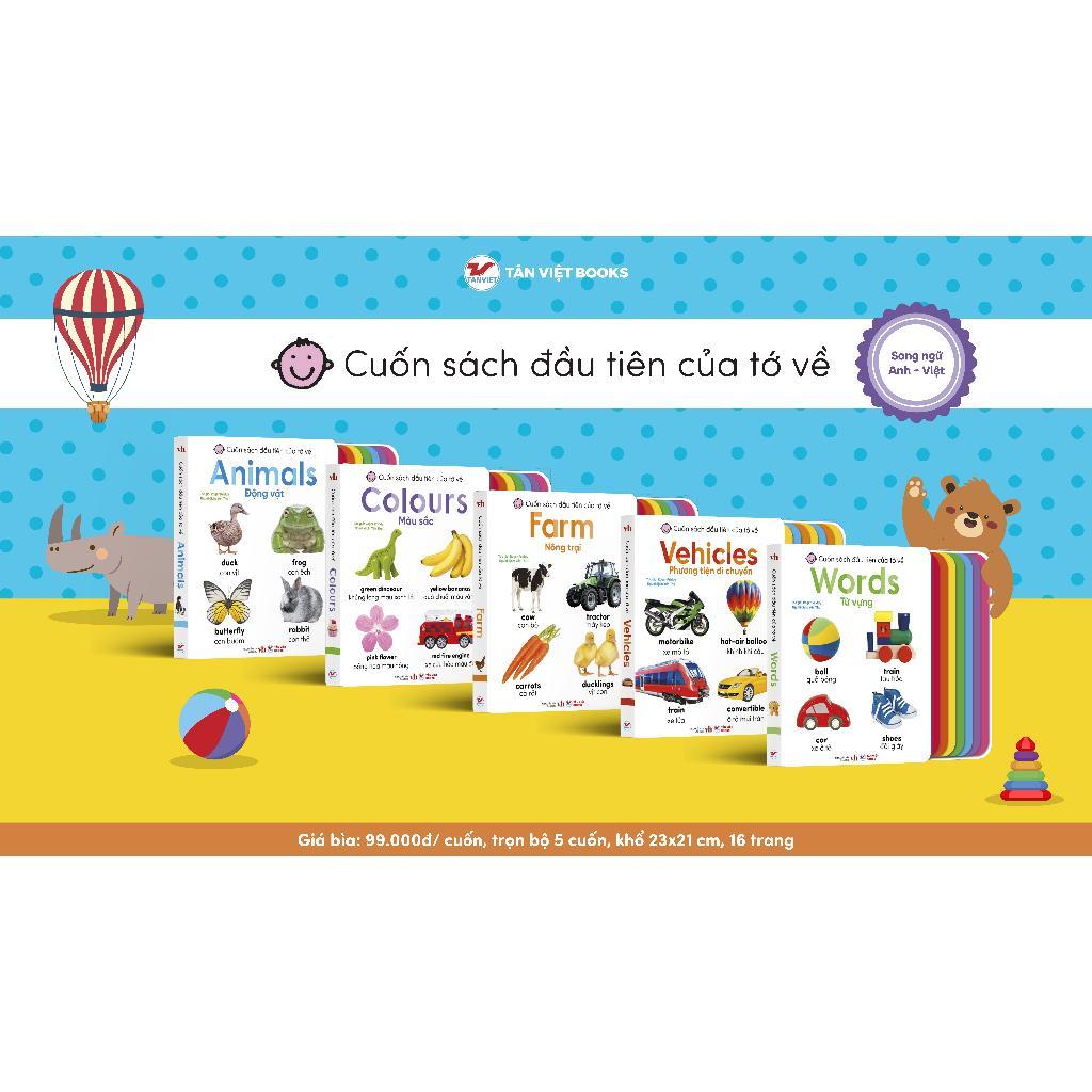 Mua tại TiktokSách - Cuốn Sách Đầu Tiên Của Tớ Về - Song Ngữ Anh - Việt Cuốn sách đầu tiên của tớ về là một bộ sách song ngữ Anh-Việt vô cùng đáng yêu, thú vị và đầy thiết thực bao gồm những chủ đề gần gũi, thân thuộc với bé. Bộ sách bao gồm 5 cuốn: Animals – Động vật: Cuốn sách song ngữ Anh-Việt này cung cấp rất nhiều từ vựng đơn giản liên quan đến động vật, từ thú cưng, bò sát, vật nuôi trong trang trại cho đến động vật dưới đại dương hay động vật sống ở vùng cực. Colours – Màu sắc: Cuốn sách song ngữ Anh-Việt này cung cấp rất nhiều từ vựng đơn giản liên quan đến 7 màu sắc cơ bản (đỏ, cam, vàng, xanh lá, xanh da trời, xám và hồng). Bên cạnh đó, bé còn được làm quen và nhận biết nhiều đồ vật, phương tiện, các loài động - thực vật bé dễ dàng bắt gặp trong cuộc sống. Words – Từ vựng: Cuốn sách song ngữ Anh-Việt này cung cấp rất nhiều từ vựng về đa dạng các chủ đề như thức ăn, phương tiện giao thông, động vật, thiên nhiên, trang phục bé thường mặc, đồ chơi… Vehicles – Phương tiện giao thông: Cuốn sách song ngữ Anh-Việt này cung cấp rất nhiều từ vựng liên quan đến các phương tiện di chuyển thân thuộc, từ những loại xe ô tô như mui trần, xe đua, siêu xe cho đến các loại xe ưu tiên, các phương tiện đường sắt hay phương tiện trên không. Farm – Nông trại: Cuốn sách song ngữ Anh-Việt này cung cấp rất nhiều từ vựng liên quan đến nông trại. Các bé sẽ vừa được làm quen với những loài động vật đáng yêu, những nông cụ quen thuộc cho đến các loại trái cây và rau củ, hay các phương tiện máy móc mà người nông dân thường sử dụng. Cuối mỗi trang sách sẽ là một câu hỏi ứng dụng để người lớn (thầy cô, cha mẹ…) có thể hỏi bé, từ đó vừa giúp bé ghi nhớ và ôn luyện lại những từ vựng đã học, vừa mở rộng vốn hiểu biết và thế giới quan của bé. Thông qua bộ sách này, các bạn nhỏ sẽ được trau dồi nhiều vốn từ vựng hơn, rèn luyện kĩ năng phát âm và nói (cả tiếng Anh và tiếng Việt), đồng thời gắn kết các thành viên trong gia đình với nhau thông qua những giờ vừa học vừa chơi vui vẻ. Với những hình ảnh sinh động và từ vựng chú thích đơn giản, bộ sách sẽ giúp các bé phát triển ngôn ngữ và rèn luyện kĩ năng nói một cách hiệu quả. Bộ sách chắc chắn sẽ là người bạn hữu ích, tuyệt vời trong những năm tháng đầu đời khi bé bắt đầu hành trình khám phá thế giới.