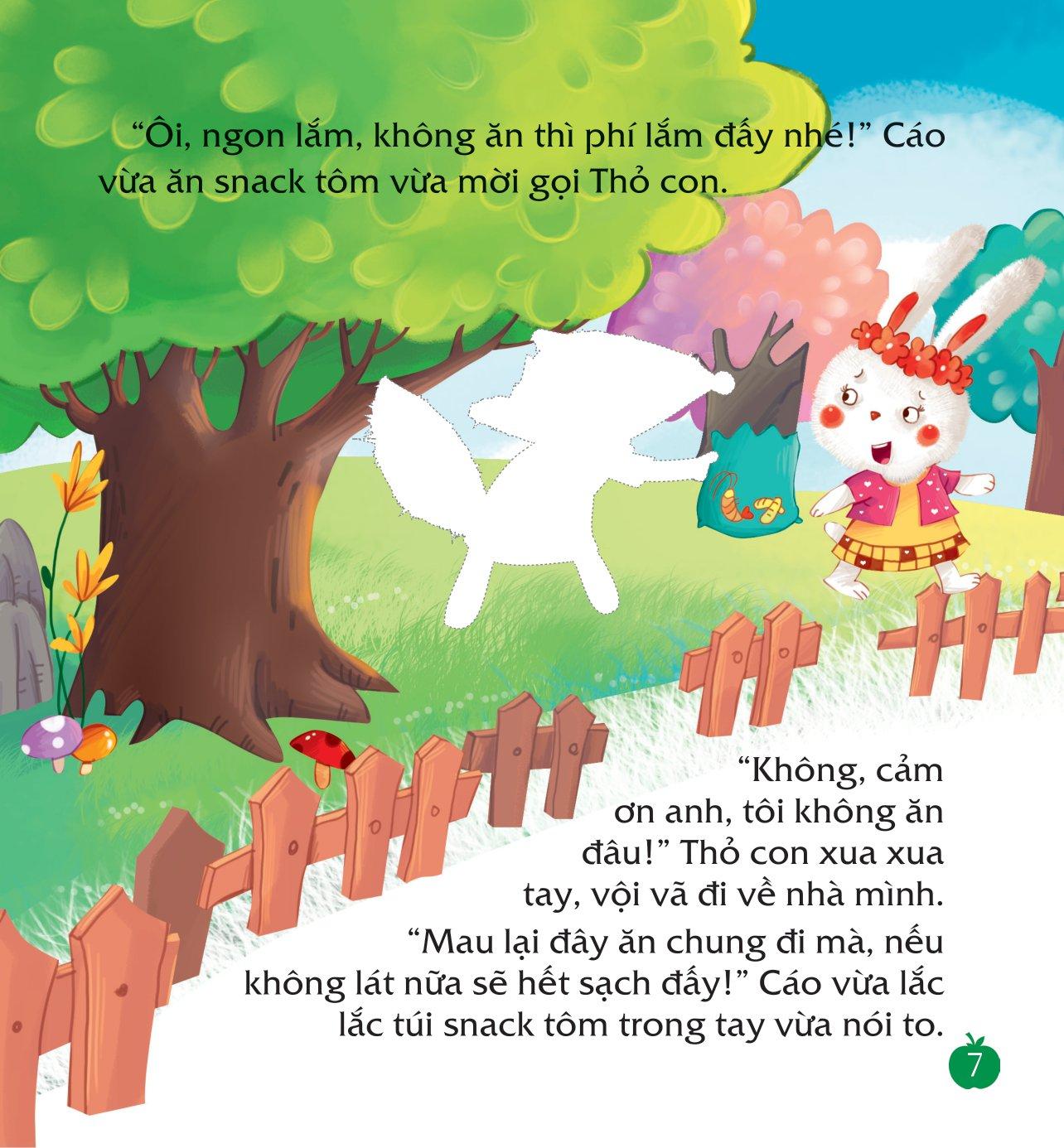 “Thỏ con ơi , mau lại đây ăn snack tôm nào!” Cáo đứng dưới gốc cây râm mát mời gọi bạn ấy. “Rồm rộp, rồm rộp”, Thỏ con nghe thấy tiếng nhai snack tôm giòn rụm của Cáo, lại ngửi thấy mùi thơm lừng nữa, khiến nước miếng của bạn ấy sắp chảy cả ra ngoài. “Không, cảm ơn anh, tôi không ăn đâu!” Thỏ con lắc đầu, vội vã đi nhanh về nhà.
