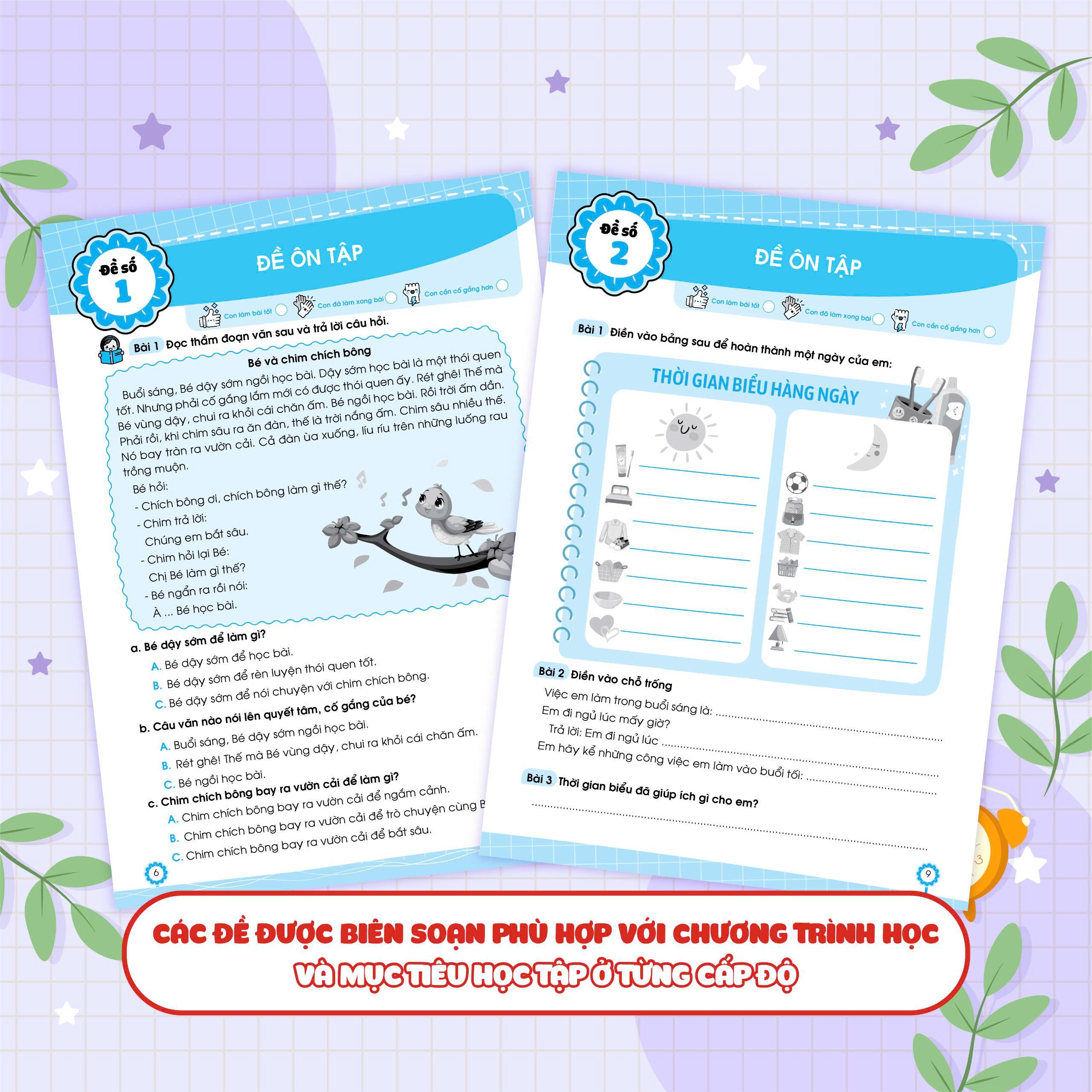 - Sách được chia thành 2 phần rất dễ hiểu cho các bé: Phần đề ôn tập và Phần đề kiểm tra. Phần đề ôn tập: Gồm 15 đề được chia theo các chủ điểm, hoặc chia thành các đề ôn tập theo sát chương trình học trên lớp theo giai đoạn. Phần đề kiểm tra: Gồm 5 đề kiểm tra cuối học kỳ để kiểm tra, đánh giá kiến thức tổng hợp của học sinh.