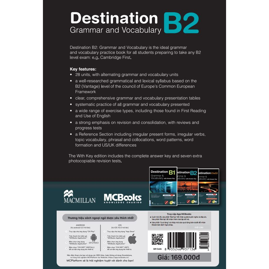 Destination B2: Grammar & Vocabulary được thiết kế dành cho những người chuẩn bị thi B2 - FCE. Cuốn sách tập trung vào những kiến thức ngữ pháp, từ vựng tiếng Anh thường xuyên sử dụng trong bài thi B2, thích hợp dành cho người học ở trình độ Intermediate, Upper Intermediate hoặc Advanced. Tài liệu trong sách dựa theo mức trình độ B1, B2, C1 và C2 chuẩn khung châu Âu.