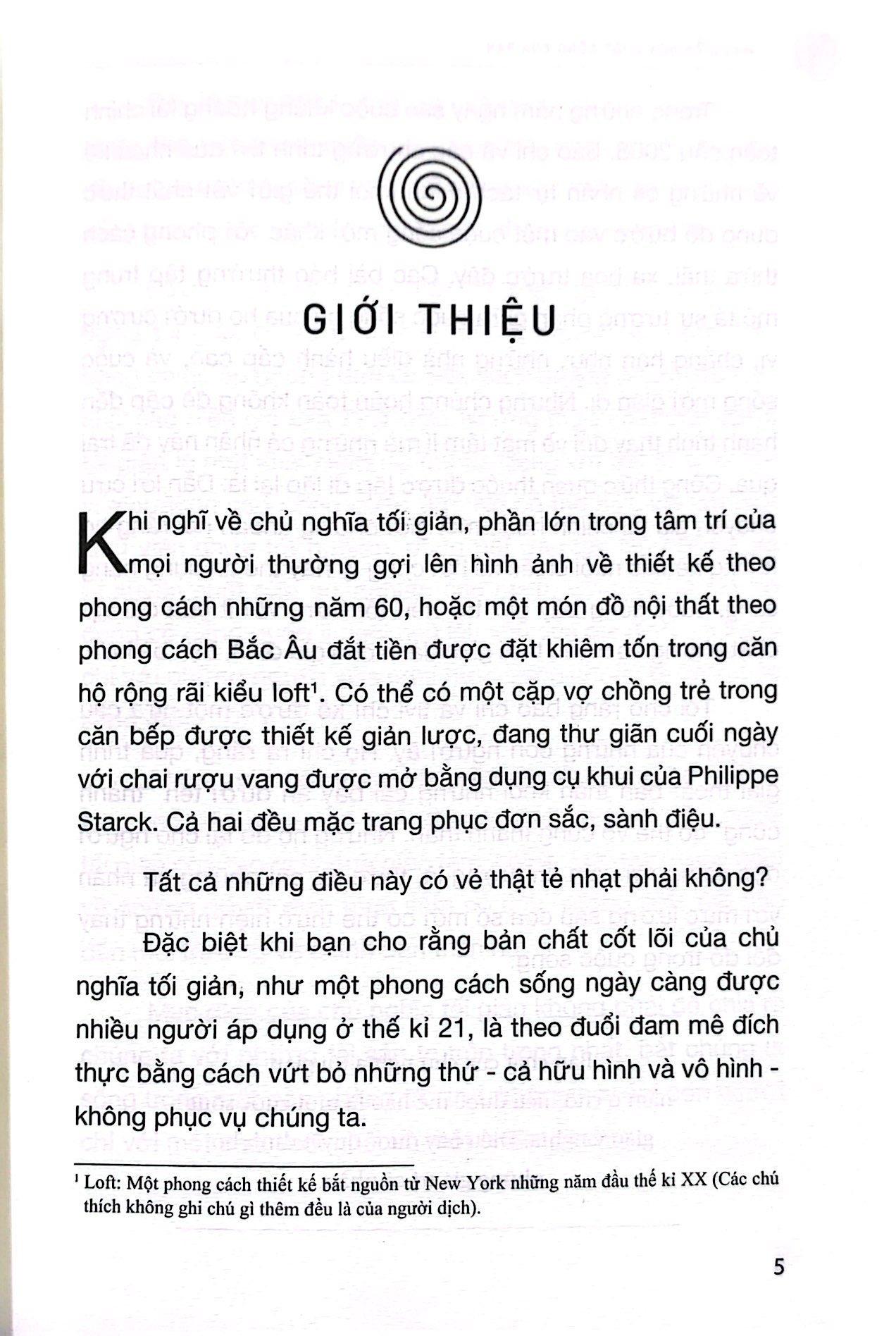 Đây là cuốn sách thực sự cần thiết được xây dựng theo phong cách dễ tiếp cận rất độc đáo trong thời điểm phức tạp và đầy thử thách này. Tác giả khuyến khích người đọc nhìn lại lối sống hiện tại một cách không phán xét và hài hước, đồng thời thực hiện lối sống tối giản để loại bỏ bớt gánh nặng cả về mặt vật chất lẫn tinh thần.
