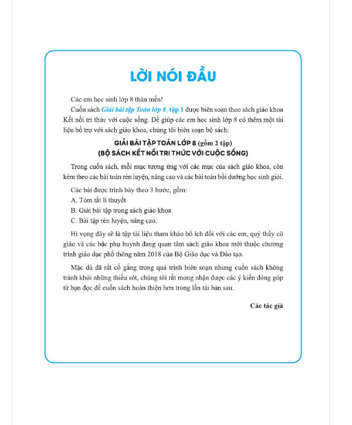 Cuốn sách Giải bài tập Toán lớp 8, được biên soạn theo sách giáo khoa Kết nối tri thức với cuộc sống nhằm giúp các em học sinh lớp 8 có thêm một tài liệu bổ trợ với sách giáo khoa.