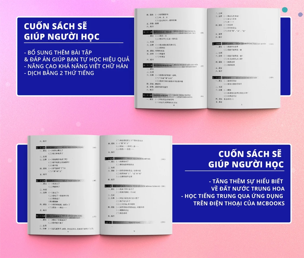 Các bài học trong “Giáo trình Hán ngữ 2 Tập 1 Quyển hạ phiên bản 3″ được Mcbooks thiết kế như sau: 1. Bài đọc, 2. Từ mới, 3. Chú thích, 4. Ngữ âm, Ngữ