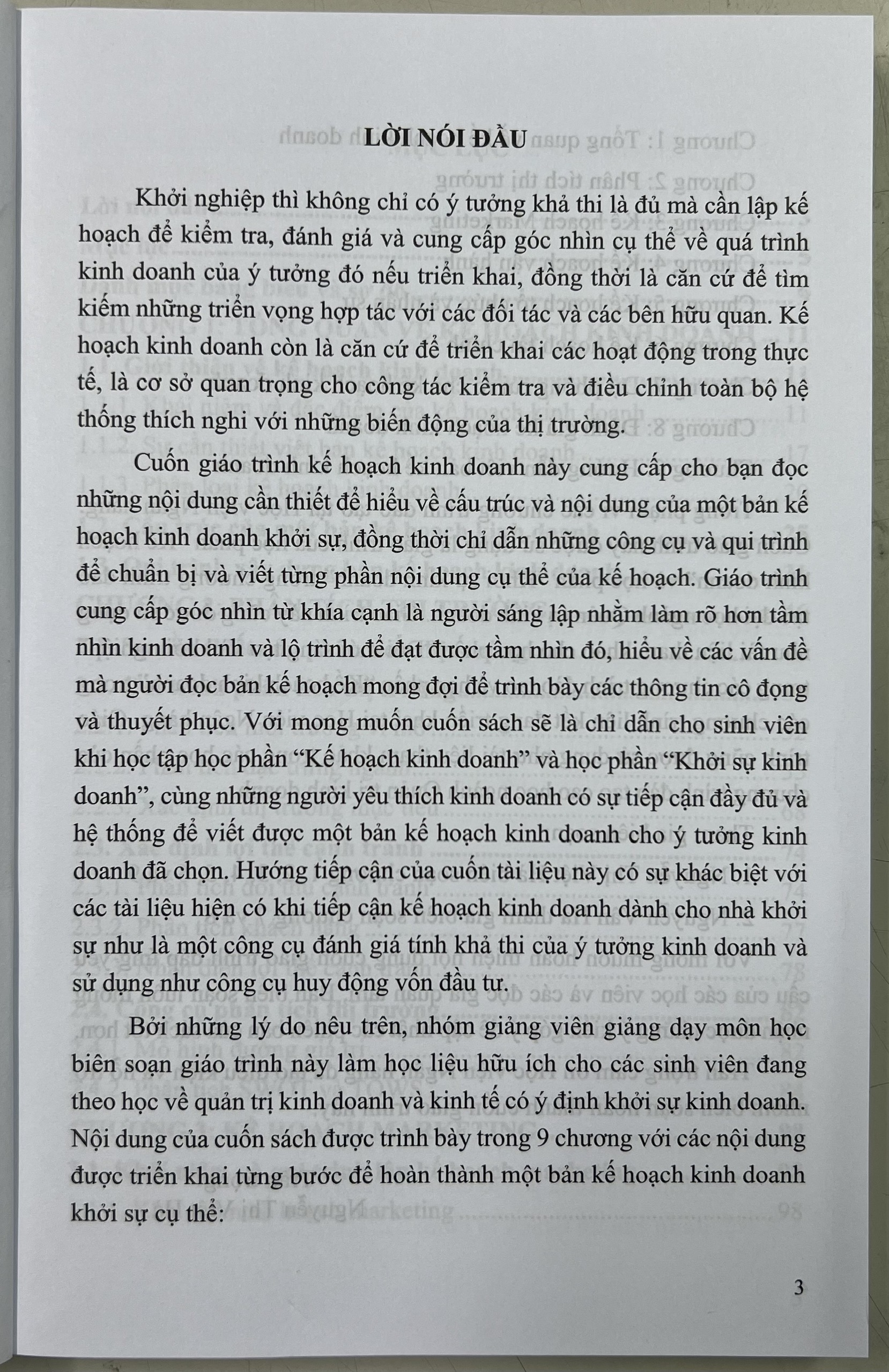 Cuốn giáo trình kế hoạch kinh doanh này cung cấp cho bạn đọc những nội dung cần thiết để hiểu về cấu trúc và nội dung của một bản kế hoạch kinh doanh khởi sự, đồng thời chỉ dẫn những công cụ và qui trình để chuẩn bị và viết từng phần nội dung cụ thể của kế hoạch. Giáo trình cung cấp góc nhìn từ khía cạnh là người sáng lập nhằm làm rõ hơn tầm nhìn kinh doanh và lộ trình để đạt được tầm nhìn đó, hiểu về các vấn đề mà người đọc bản kế hoạch mong đợi để trình bày các thông tin cô đọng và thuyết phục. Với mong muốn cuốn sách sẽ là chỉ dẫn cho sinh viên khi học tập học phần “Kế hoạch kinh doanh” và học phần “Khởi sự kinh doanh”, cùng những người yêu thích kinh doanh có sự tiếp cận đầy đủ và hệ thống để viết được một bản kế hoạch kinh doanh cho ý tưởng kinh doanh đã chọn. Hướng tiếp cận của cuốn tài liệu này có sự khác biệt với các tài liệu hiện có khi tiếp cận kế hoạch kinh doanh dành cho nhà khởi sự như là một công cụ đánh giá tính khả thi của ý tưởng kinh doanh và sử dụng như công cụ huy động vốn đầu tư. Bởi những lý do nêu trên, nhóm giảng viên giảng dạy môn học biên soạn giáo trình này làm học liệu hữu ích cho các sinh viên đang theo học về quản trị kinh doanh và kinh tế có ý định khởi sự kinh doanh. Nội dung của cuốn sách được trình bày trong 9 chương với các nội dung được triển khai từng bước để hoàn thành một bản kế hoạch kinh doanh khởi sự cụ thể: