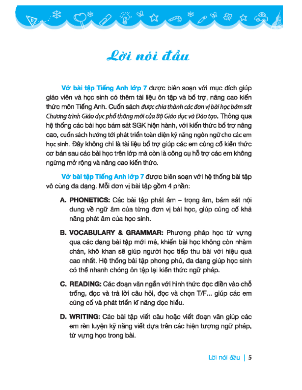Vở bài tập Tiếng Anh lớp 7 được biên soạn với mục đích giúp giáo viên và học sinh có thêm tài liệu ôn tập và bổ trợ, nâng cao kiến thức môn Tiếng Anh. Cuốn sách được chia thành các đơn vị bài học bám sát Chương trình Giáo dục phổ thông mới của Bộ Giáo dục và Đào tạo. Thông qua hệ thống các bài học bám sát SGK hiện hành, với kiến thức bổ trợ nâng cao, cuốn sách hưởng tới phát triển toàn diện kỹ năng ngôn ngữ cho các em học sinh. Đây không chỉ là tài liệu bổ trợ giúp các em củng cố kiến thức cơ bản sau các bài học trên lớp mà còn là công cụ hỗ trợ các em không ngừng mở rộng và nâng cao kiến thức.