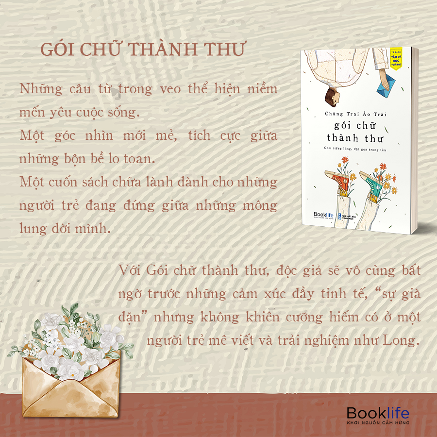 GÓI CHỮ THÀNH THƯ Những câu từ trong veo thể hiện niềm mến yêu cuộc sống. Một góc nhìn mới mẻ, tích cực giữa những bộn bề lo toan. Một cuốn sách chữa lành dành cho những người trẻ đang đứng giữa những mông lung đời mình. Cuốn sách Gói chữ thành thư là một tuyển tập gồm 66 bức thư của tác giả gửi đến những đối tượng khác nhau mà trong cuộc sống: từ những người thân yêu xung quanh anh như bố mẹ, bà, những người thân và cả những đối tượng “vô hình” như nỗi buồn, niềm vui hay chính bản thân trong tương lai. Mỗi bức thư của anh chất chứa những cảm xúc chân thành tự đáy lòng, những chiêm nghiệm đơn giản nhưng dạt dào cảm xúc về cuộc sống. Đọc thư của anh giống hệt như uống một tách trà, độc giả có thể cảm nhận được vị đắng khi vừa nhấp môi nhưng rồi khi vị đắng đầu môi qua đi, dư vị còn lại là những ngọt ngào nơi cuống họng. Với Gói chữ thành thư, độc giả sẽ vô cùng bất ngờ trước những cảm xúc đầy tinh tế, “sự già dặn” nhưng không khiên cưỡng hiếm có ở một người trẻ mê viết và trải nghiệm như Long. Cuốn sách được chia thành 4 chương Chương 1: Gõ cửa, chữ treo trước thềm nhà Chương 2: Gom tiếng lòng, đặt gọn trong tim Chương 3: Vẫy vùng trong cảm xúc Chương 4: Gói chữ, nghe bình yên