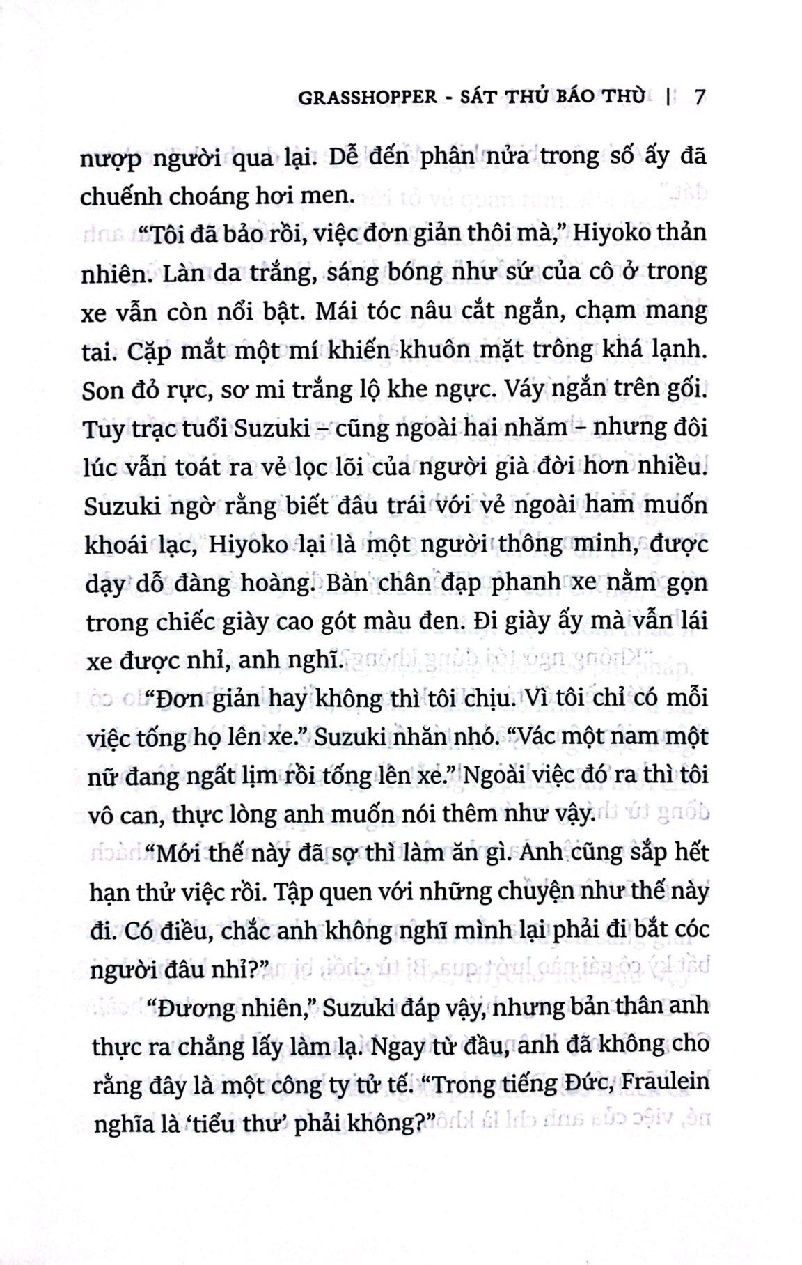 Hồi hộp, nghẹt thở, nhưng cũng không kém phần hài hước và sâu sắc, Grasshopper - Sát thủ báo thù là một tác phẩm xuất sắc của Isaka Kotaro, bậc thầy của những cuốn sách hành động kịch tính và hấp dẫn người đọc tới những trang cuối cùng.