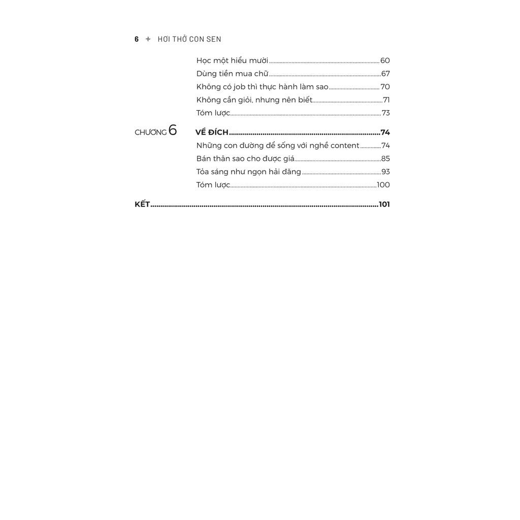 Sự lên ngôi của content là một điều tất yếu, là xu hướng lâu dài mà không ai có thể đứng ngoài. Dù bạn muốn tiến xa ở bất cứ vị trí nào trong Digital Marketing, kiến thức content vẫn là thứ mà bạn phải nắm chắc. Và để sống tốt với nghề content thì chúng ta cần có hai thứ: Kỹ năng chuyên môn và tư duy phát triển bản thân. Một thứ giúp bạn giải quyết những công việc cụ thể hàng ngày, thứ còn lại giúp bạn đi nhanh hơn và xa hơn trong nghề. Cuốn sách Hơi thở con Sen được lên ý tưởng theo concept “hai nửa lộn ngược”, mỗi nửa sẽ tiếp cận theo một hướng khác nhau, một nửa nói về ngành, nửa còn lại nói về con người. Với những kinh nghiệm qua 10 năm làm nghề, tác giả vẽ ra một tấm bản đồ cho hành trình vào nghề content cùng những bài học quý giá trên hành trình phát triển sự nghiệp của người làm nghề, từ đó cho độc giả hành trang cùng sự tự tin để đi xa và nhanh hơn trong nghề content.