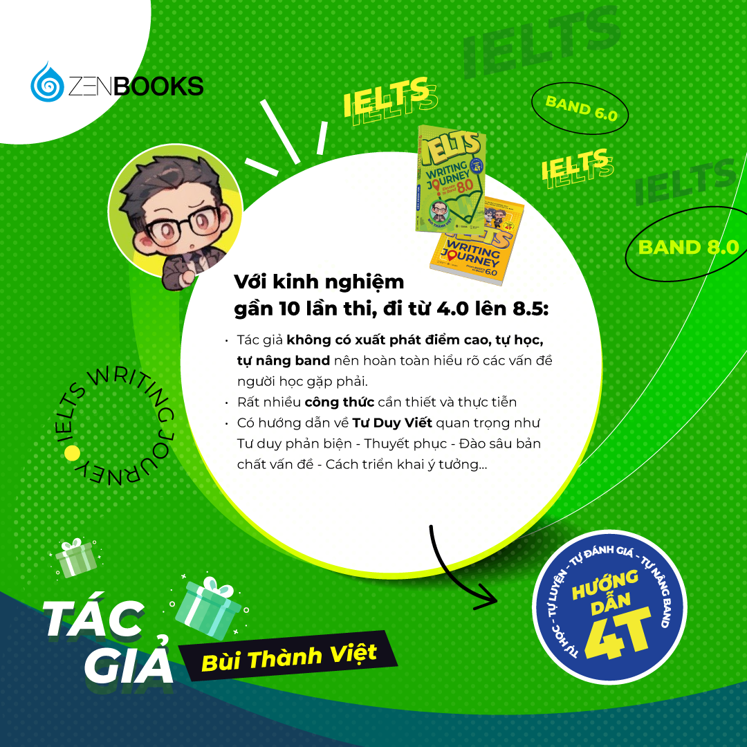 Với tác giả Bùi Thành Việt - có kinh nghiệm gần 10 lần thi, đi từ 4.0 lên 8.5 overall, xuất phát điểm không quá cao, bằng con đường tự tìm tòi, tự học hỏi - tác giả hoàn toàn hiểu được những khó khăn mà người học gặp phải trong quá trình ôn tập. Từ đó, tác giả rút ra rất nhiều công thức cần thiết và thực tiễn, đúc kết lại một cách hoàn chỉnh nhất trong cuốn sách IELTS Writing Journey: Elevate to Band 8.0.