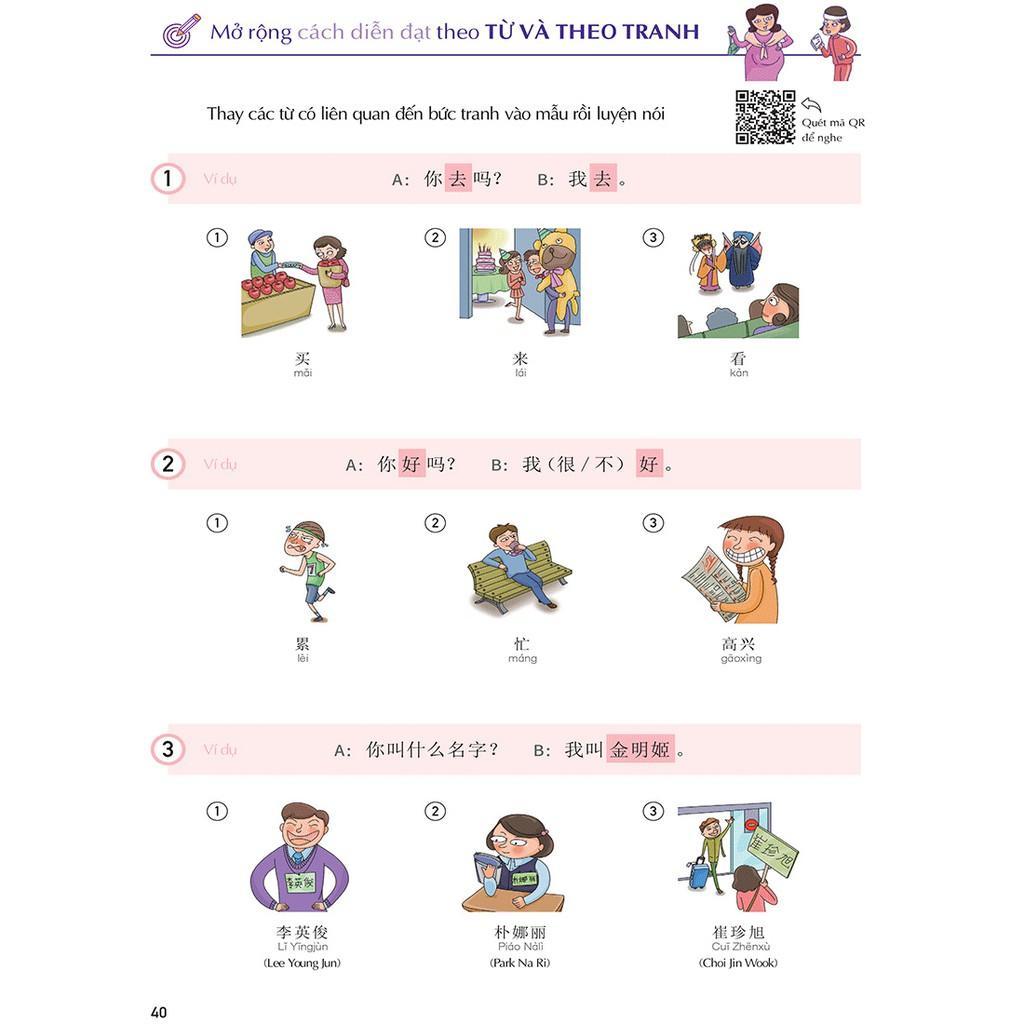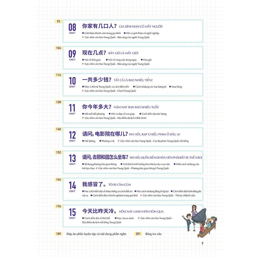 - Cấu trúc bài học chặt chẽ 15 bài học được hiệu đính tỉ mỉ, hoàn toàn khác biệt với những giáo trình tiếng Trung nặng nề khô khan khác. Mỗi bài học sẽ có cấu trúc như sau: Góc nhìn văn hóa Trung Quốc: Hình ảnh và mô tả ngắn gọn liên quan đến chủ đề bài học Cách diễn đạt cần thiết cho người mới bắt đầu Học từ vựng qua tranh Tự tin với hội thoại dài Mở rộng cách diễn đạt theo tranh và từ vựng Nâng cao năng lực bằng bài kiểm tra tổng kết