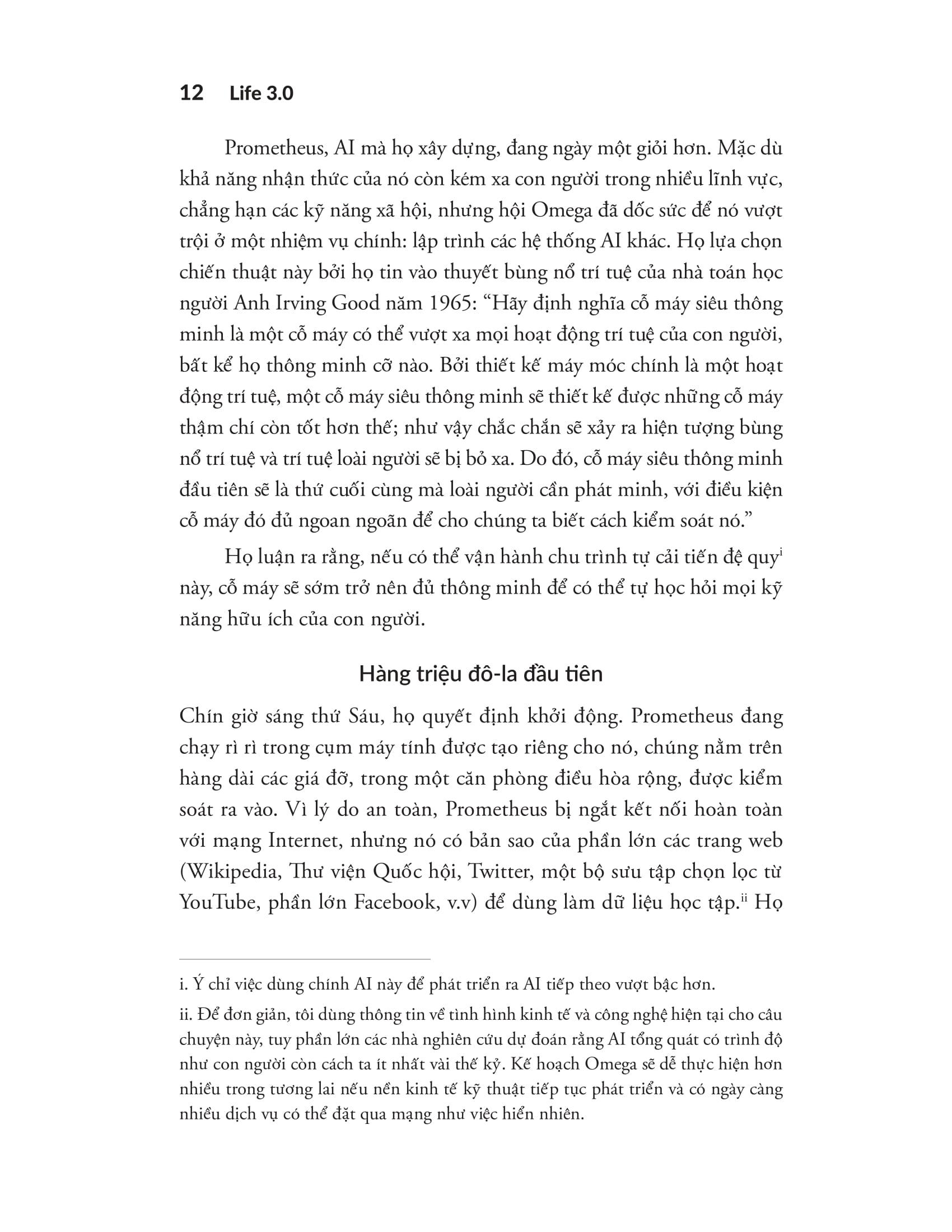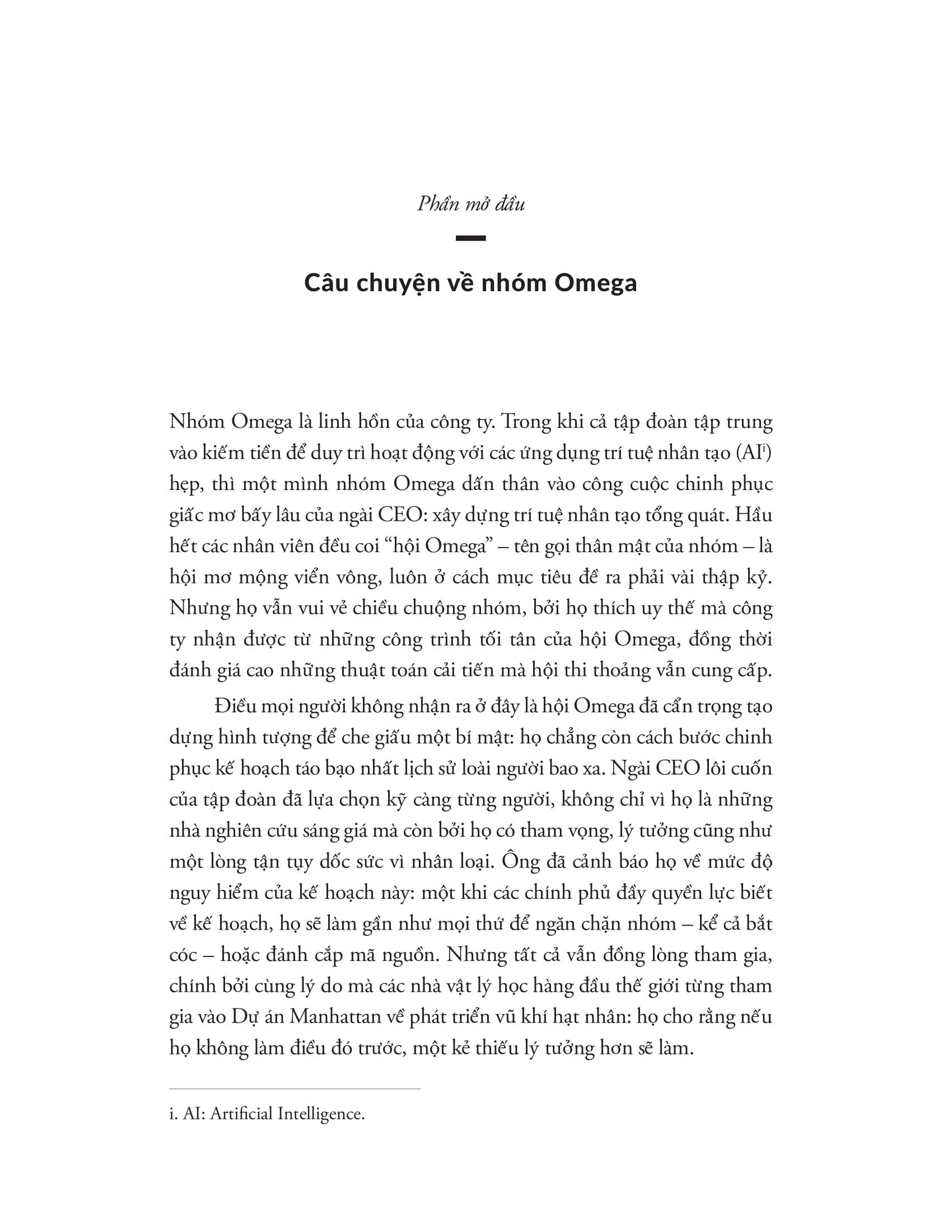 Ngay phần mở đầu, Max Tegmark đã đưa người đọc vào một thế giới tưởng tượng đến nghẹt thở với nhóm Omega và AI Prometheus, tái hiện một viễn cảnh đầy hấp dẫn: nếu con người thật sự tạo ra một AI siêu việt thì chuyện gì sẽ xảy ra?