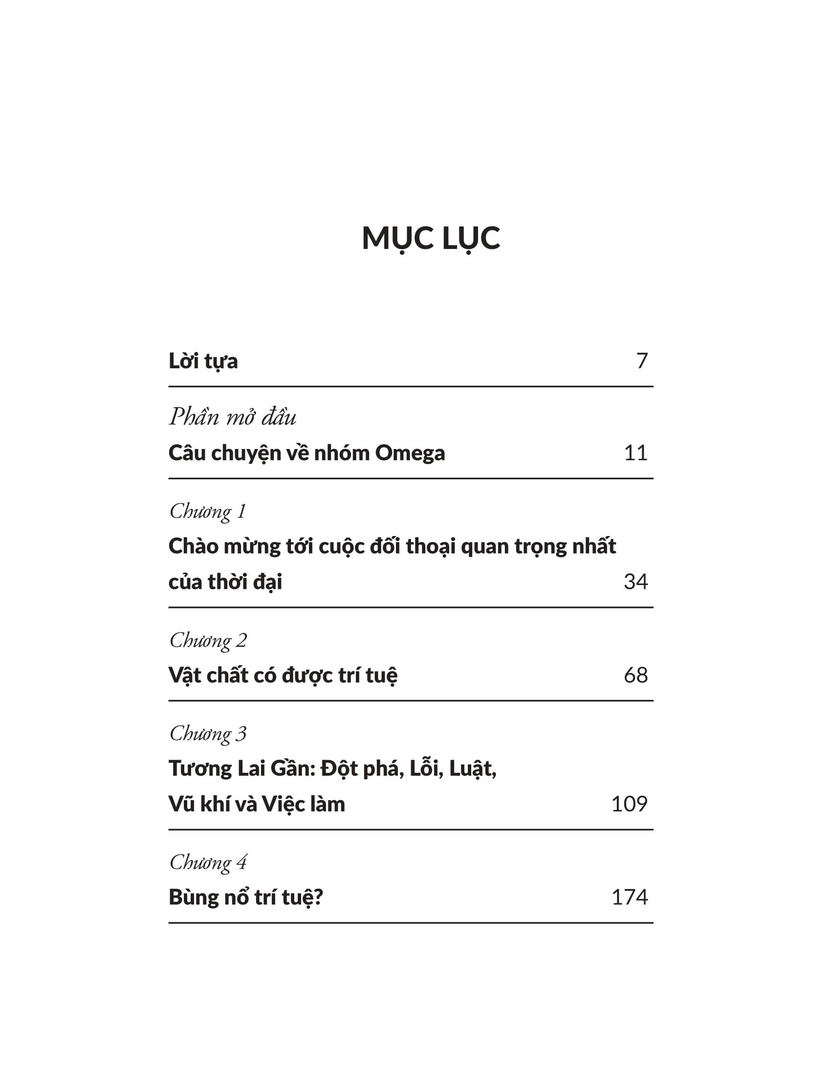 “Đó là câu chuyện của nhóm Omega. Phần còn lại của cuốn sách này nói về một câu chuyện khác hãy còn chưa được viết: tương lai của chính chúng ta với AI. Bạn muốn nó diễn ra như thế nào? Liệu điều xa lạ như câu chuyện của nhóm Omega có khả năng xảy ra không, và nếu có thì bạn muốn nó xảy ra chứ? Bỏ qua những phán đoán về AI siêu phàm, bạn muốn câu chuyện của chúng ta bắt đầu như thế nào? Bạn muốn AI tác động đến công việc, luật pháp và v.ũ khí trong thập kỷ tới theo cách nào? Nhìn xa hơn về phía trước, bạn sẽ viết nên kết cục như thế nào? Đây sẽ là một câu chuyện thực sự vĩ đại, bởi nó không chứa đựng điều gì ngoài chính vận mệnh tương lai của sự sống trong vũ trụ chúng ta. Và đó là câu chuyện chúng ta phải viết.”