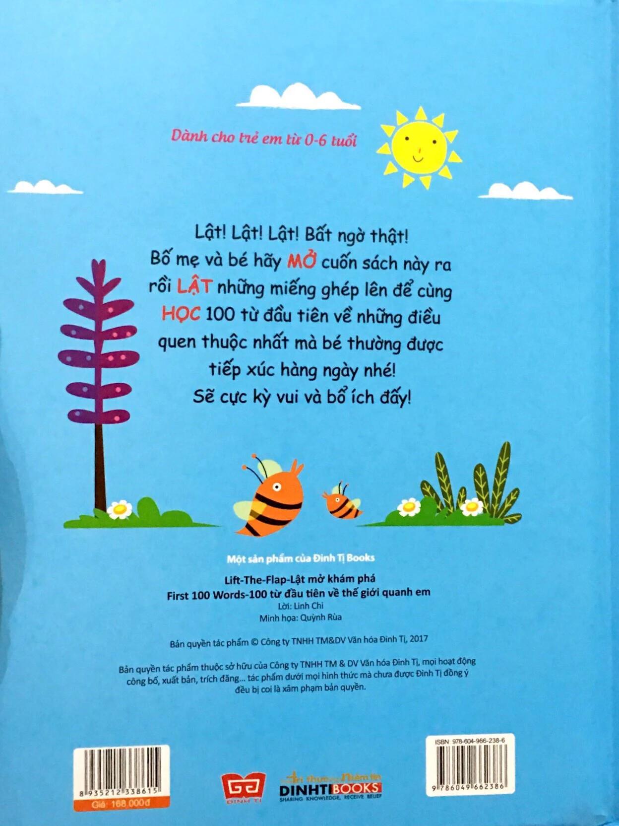 Cuốn sách lật mở Lift-the-flap – Lật mở khám phá thế giới – 100 từ mới đầu tiên về thế giới quanh em là cuốn sách song ngữ Việt – Anh tổng hợp 100 từ vựng cơ bản về các chủ đề: Gia đình, hình dạng, màu sắc, cơ thể người, thời gian, thiên nhiên,…dành cho bé 1-10 tuổi.Điểm đặc biệt của cuốn sách là tất cả các từ vựng đều được hình ảnh hóa qua bức tranh đầy màu sắc và xuất hiện đầy bất ngờ qua từng miếng lật mở với đủ hình dạng khác nhau. Cuốn sách lật mở là hình thức sách tranh mới mẻ với những ưu điểm đặc biệt giúp bé ghi nhớ từ mới nhanh chóng, đồng thời giúp tăng thêm khả năng tưởng tượng của bé qua các hình ảnh chân thực của từng miếng lật mở 2D.