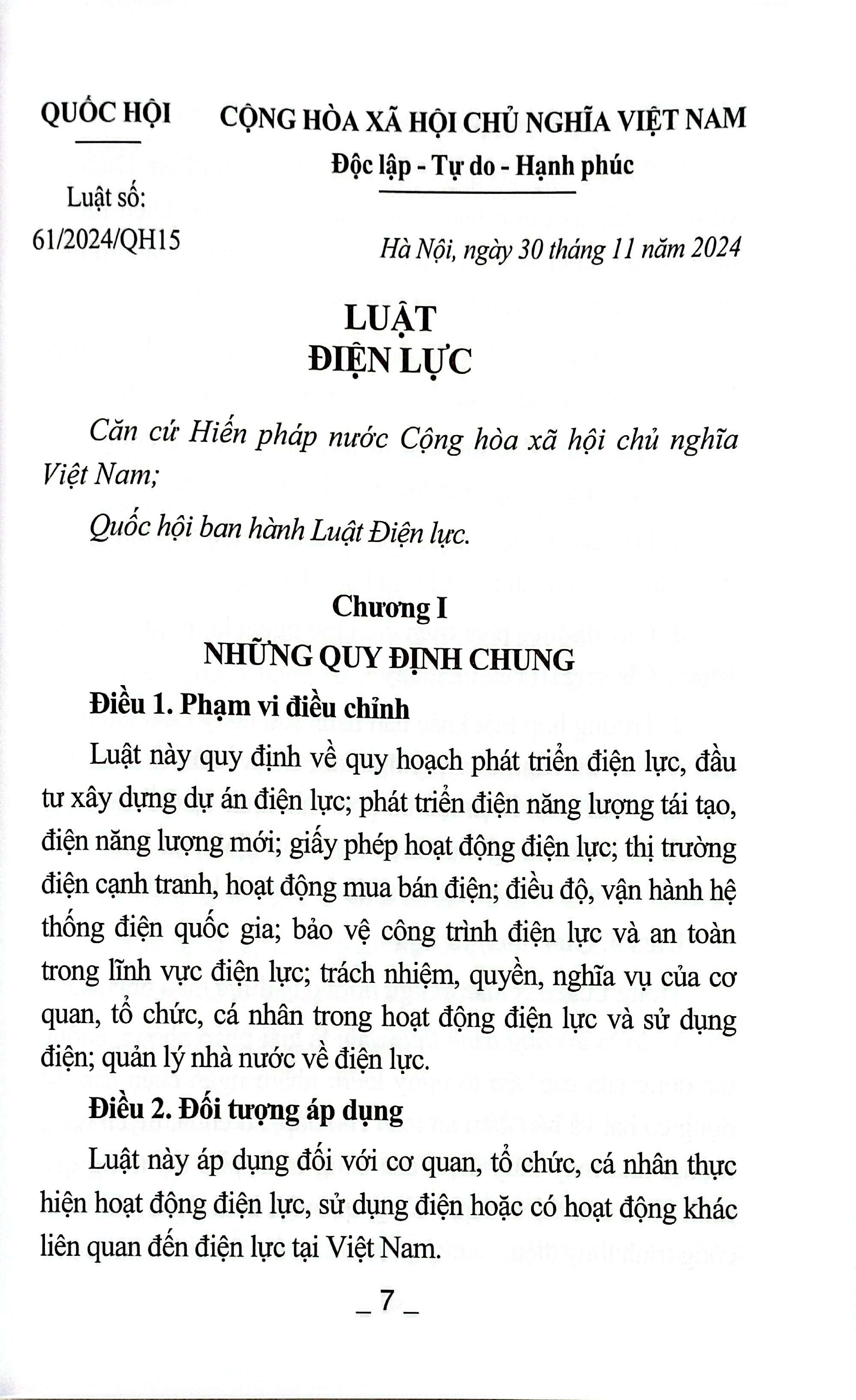 Luật Điện Lực Ngày 30/11/2024, Quốc hội đã thông qua Luật Điện lực số 61/2024/QH15. Theo đó, Luật có một số nội dung đáng chú ý: Giá bán điện thực hiện theo cơ chế thị