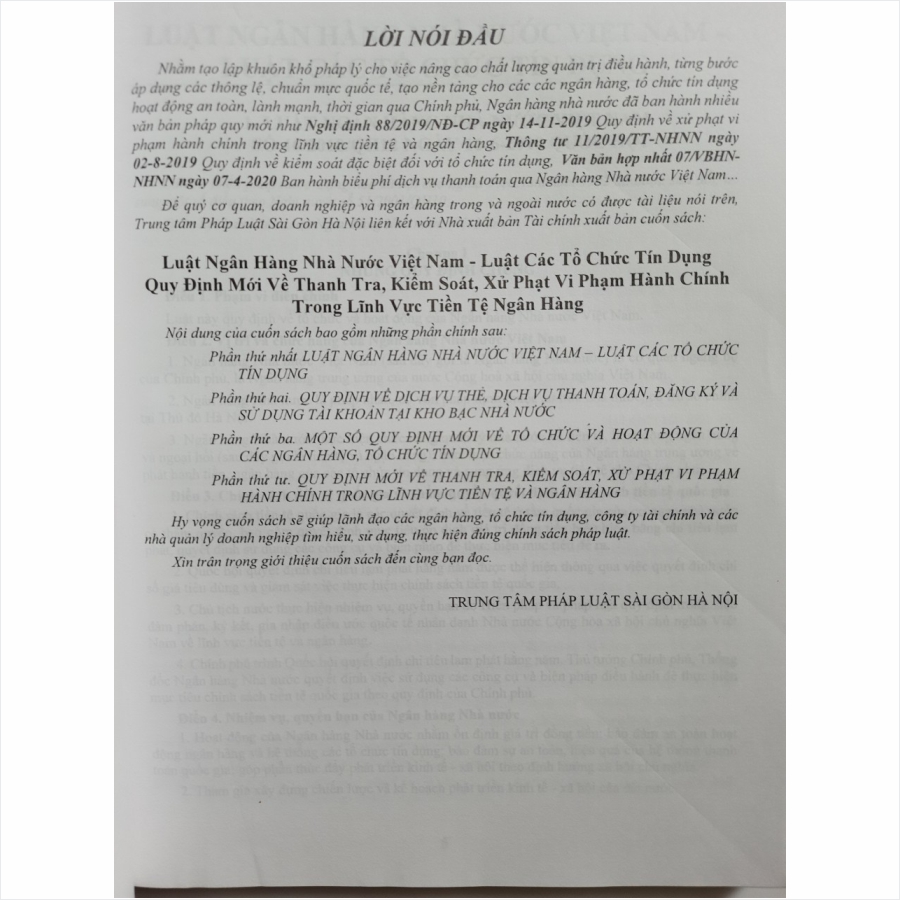 - Toàn bộ sách bìa mềm khổ lớn 20 x 28 cm phân phối bởi Nhà sách Nam Việt đều được bọc sách Plastic MIỄN PHÍ và xuất hóa đơn điện tử đầy đủ, nhanh chóng. …/… Lời giới thiệu: Nhằm tạo lập khuôn khổ pháp lý cho việc nâng cao chất lượng quản trị điều hành, từng bước áp dụng các thông lệ, chuẩn mực quốc tế, tạo nền tảng cho các các ngân hàng, tổ chức tín dụng hoạt động an toàn, lành mạnh, thời gian qua Chính phủ, Ngân hàng nhà nước đã ban hành nhiều văn bản pháp quy mới như Nghị định 88/2019/NĐ-CP ngày 14/11/2019 Quy định về xử phạt vi phạm hành chính trong lĩnh vực tiền tệ và ngân hàng, Thông tư 11/2019/TT-NHNN ngày 02/8/2019 Quy định về kiểm soát đặc biệt đối với tổ chức tín dụng, Văn bản hợp nhất 07/VBHN- NHNN ngày 07/4/2020 Ban hành biểu phí dịch vụ thanh toán qua Ngân hàng Nhà nước Việt Nam… Nhằm phổ biến đến Quý Cơ quan, Đơn vị và Quý khách hàng thân thiết nắm bắt kịp thời những quy định mới nêu trên. Nhà sách Nam Việt xin trân trọng giới thiệu cuốn sách: Luật Ngân Hàng Nhà Nước Việt Nam – Luật Các Tổ Chức Tín Dụng – Quy Định Mới Về Thanh Tra, Kiểm Soát, Xử Phạt Vi Phạm Hành Chính Trong Lĩnh Vực Tiền Tệ, Ngân Hàng …/… Nội dung sách gồm 4 phần sau: Phần thứ nhất. LUẬT NGÂN HÀNG NHÀ NƯỚC VIỆT NAM – LUẬT CÁC TỔ CHỨC TÍN DỤNG Phần thứ hai. QUY ĐỊNH VỀ DỊCH VỤ THẺ, DỊCH VỤ THANH TOÁN, ĐĂNG KÝ VÀ SỬ DỤNG TÀI KHOẢN TẠI KHO BẠC NHÀ NƯỚC Phần thứ ba. MỘT SỐ QUY ĐỊNH MỚI VỀ TỔ CHỨC VÀ HOẠT ĐỘNG CỦA CÁC NGÂN HÀNG, TỔ CHỨC TÍN DỤNG Phần thứ tư. QUY ĐỊNH MỚI VỀ , KIỂM SOÁT, XỬ PHẠT VI PHẠM HÀNH CHÍNH TRONG LĨNH VỰC TIỀN TỆ VÀ NGÂN HÀNG Cảm ơn các bạn đã ghé thăm shop Nhà sách Nam Việt ! Sách Luật Ngân Hàng Nhà Nước Việt Nam – Luật Các Tổ Chức Tín Dụng – Quy Định Mới Về Thanh Tra, Kiểm Soát, Xử Phạt Vi Phạm Hành Chính Trong Lĩnh Vực Tiền Tệ, Ngân Hàng Sách Luật Ngân Hàng Nhà Nước Việt Nam – Luật Các Tổ Chức Tín Dụng – Quy Định Mới Về Thanh Tra, Kiểm Soát, Xử Phạt Vi Phạm Hành Chính Trong Lĩnh Vực Tiền Tệ, Ngân Hàng