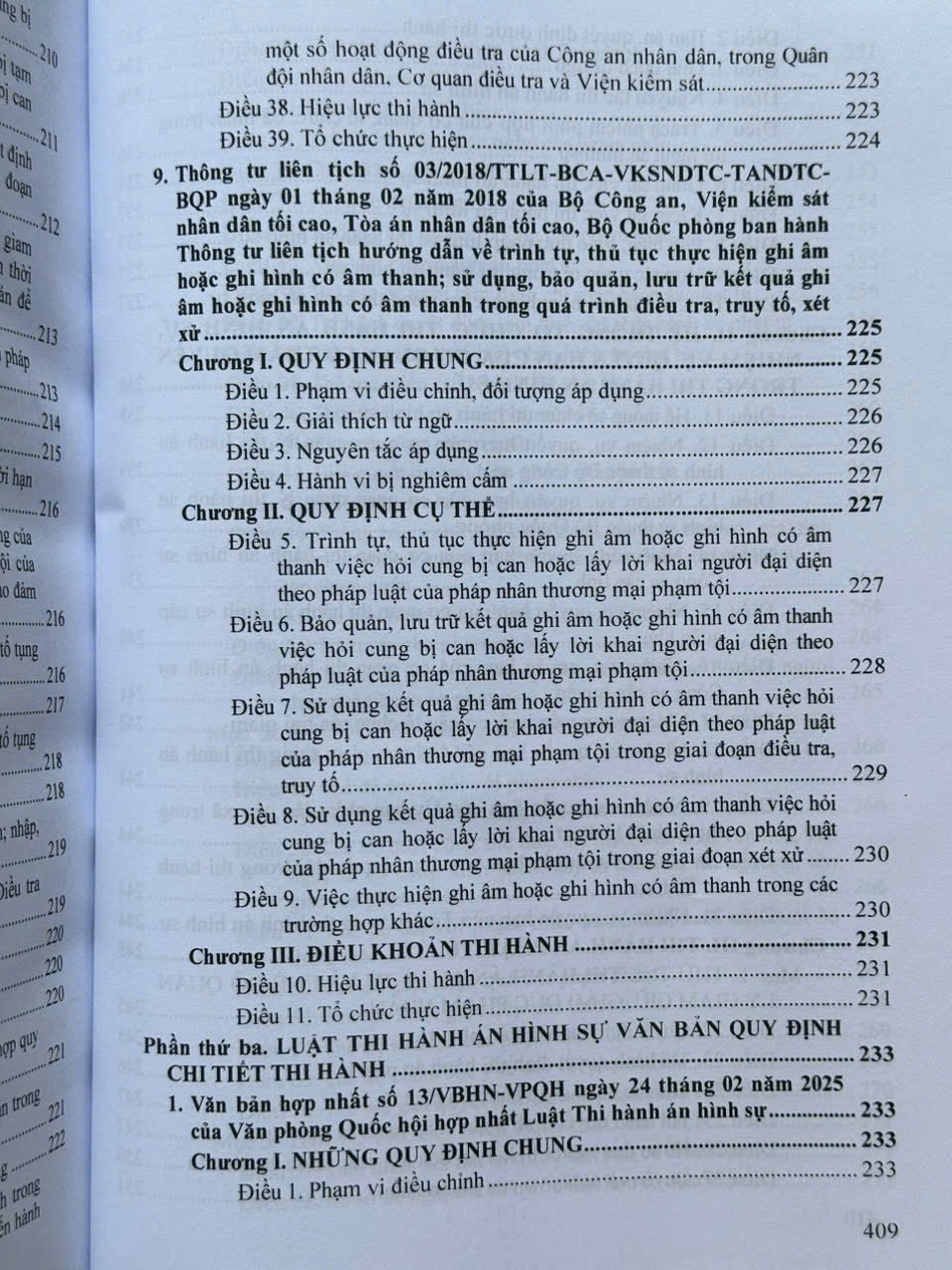 Cuốn sách gồm 9 phần, 510 điều, quy định trình tự, thủ tục tiếp nhận, giải quyết nguồn tin về tội phạm, khởi tố, điều tra, truy tố, xét xử và một số thủ tục