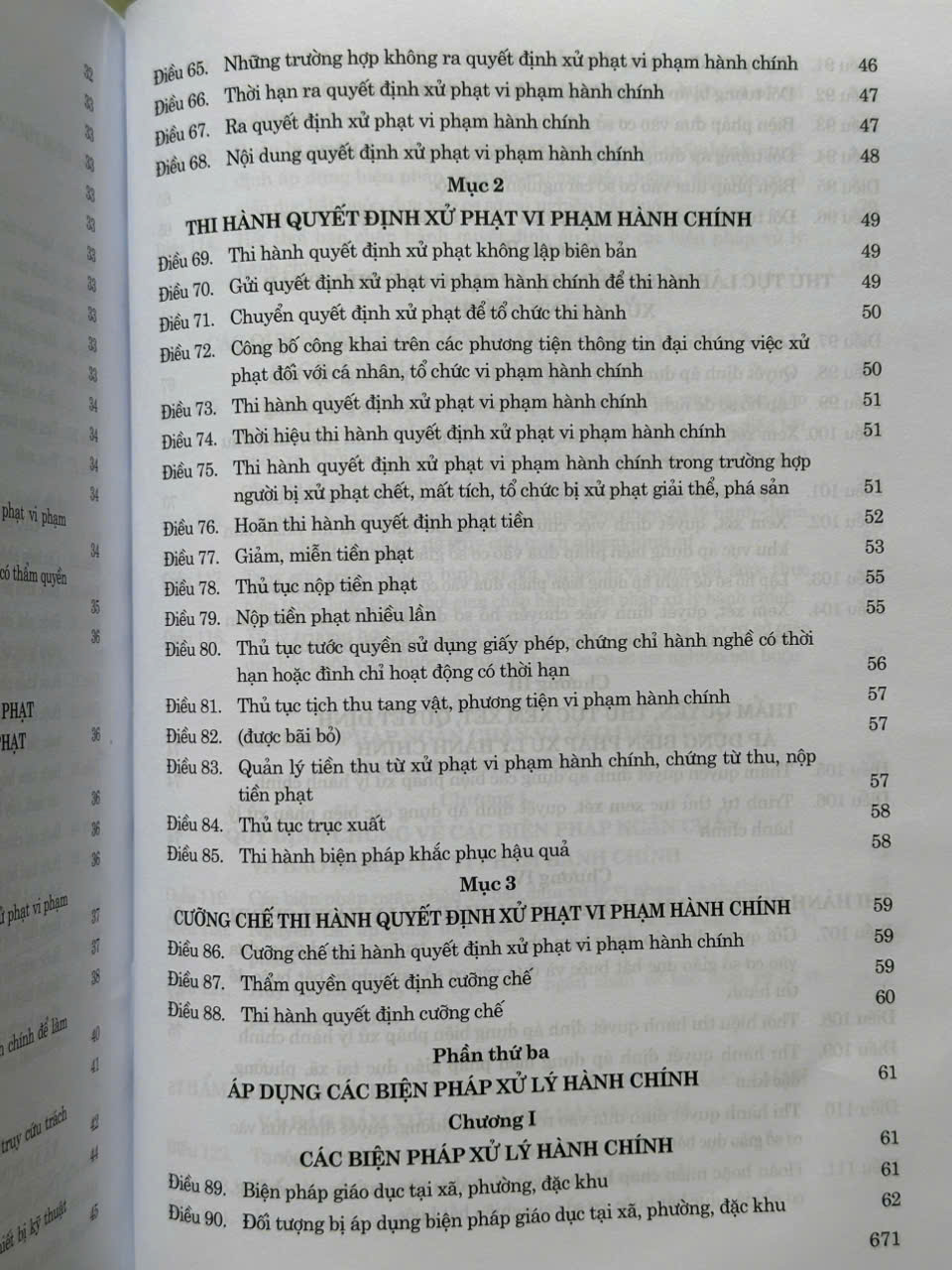 Luật gồm: – Những quy định chung – Xử phạt vi phạm hành chính – Áp dụng các biện pháp xử lý hành chính – Các biện pháp ngăn chặn và bảo đảm xử lý