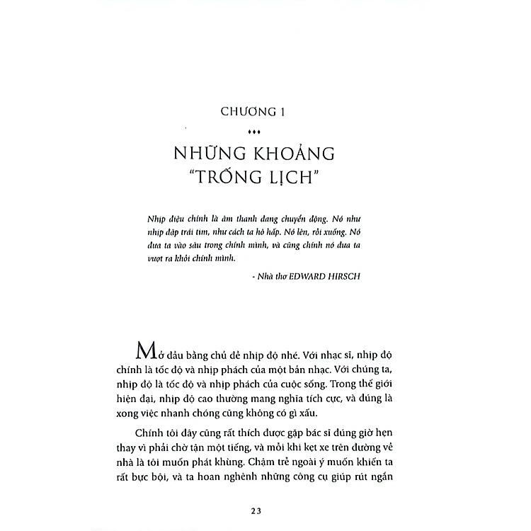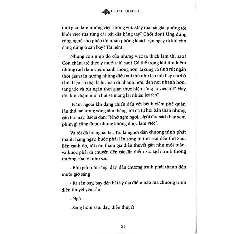 Ta đã lược bỏ nhiều thú vui chỉ vì chúng có vẻ tốn thời gian: những trận golf bị rút ngắn chỉ còn chín lỗ, những màn gặp gỡ kết bạn thưa dần, những cuộc điện thoại hàn huyên thu gọn thành tin nhắn thoại,... Ta băn khoăn khi nghĩ về ngày xưa, khi ông bà ta dư dả thời gian để chơi bóng trước sân hay lục lọi để khoe từng tấm ảnh cũ với hàng xóm.