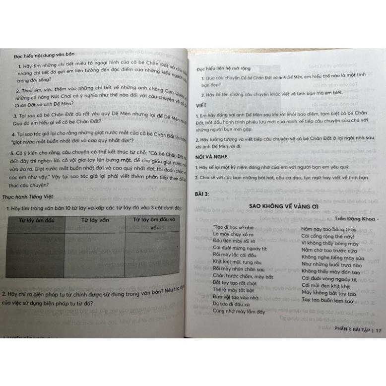 Mua tại TiktokPhần 1: Bài tập Chủ đề 1: Tôi và các bạn Chủ đề 2: Gõ cửa trái tim Chủ đề 3: Yêu thương và chia sẻ Chủ đề 4: Quê hương yêu dấu Chủ đề 5: Những nẻo đường xứ sở Chủ đề 6: Chuyện kể về những người anh hùng Chủ đề 7: Thế giới cổ tích Chủ đề 8: Khác biệt và gần gũi Chủ đề 9: Trái đất - Ngôi nhà chung Chủ đề 10: Cuốn sách tôi yêu Phần 2: Gợi ý làm bài THÔNG TIN CHI TIẾT Nhà xuất bản Đại học quốc gia Hà Nội Năm xuất bản: 2022 Tác giả: Nhiều tác giả Số trang: 260 Nhà phát hành: Học liệu