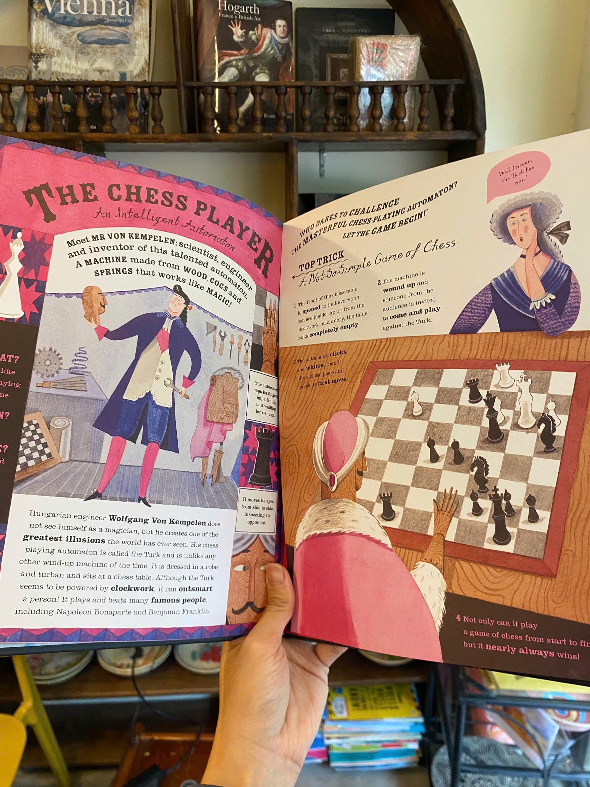 Marvellous Magicians celebrates the work of eight pioneering illusionists, both famous and under-represented, whose tricks have been the making of modern magic. Through a magical blend of biography, history and illustration, it brings these amazing magicians and their illusions into the spotlight. They include one of the first female magicians, Adelaide Herrmann, and African American illusionist Richard Potter, alongside such well-known greats as Houdini and his namesake and inspiration, Houdin. Two spectacular fold-out pages reveal the secret workings of the Automata Chess Player and Howard Thurston’s dramatic transformation of an empty box into a world of wonders, while themed spreads explore the early history of magic, the eight effects of magic on which all tricks are based, the magician’s tool box, and the under-appreciated role of the magician’s assistant. For its finale, Marvellous Magicians explores the hidden societies who have kept the secrets of illusions closely guarded for decades, provides advice on becoming a magician and introduces readers to contemporary magicians from around the world including Australia, China, Japan, Russia, South Korea, UK and USA. Written in a theatrical style and illustrated with original gouache paintings, Marvellous Magicians is the perfect book for all aspiring magicians.