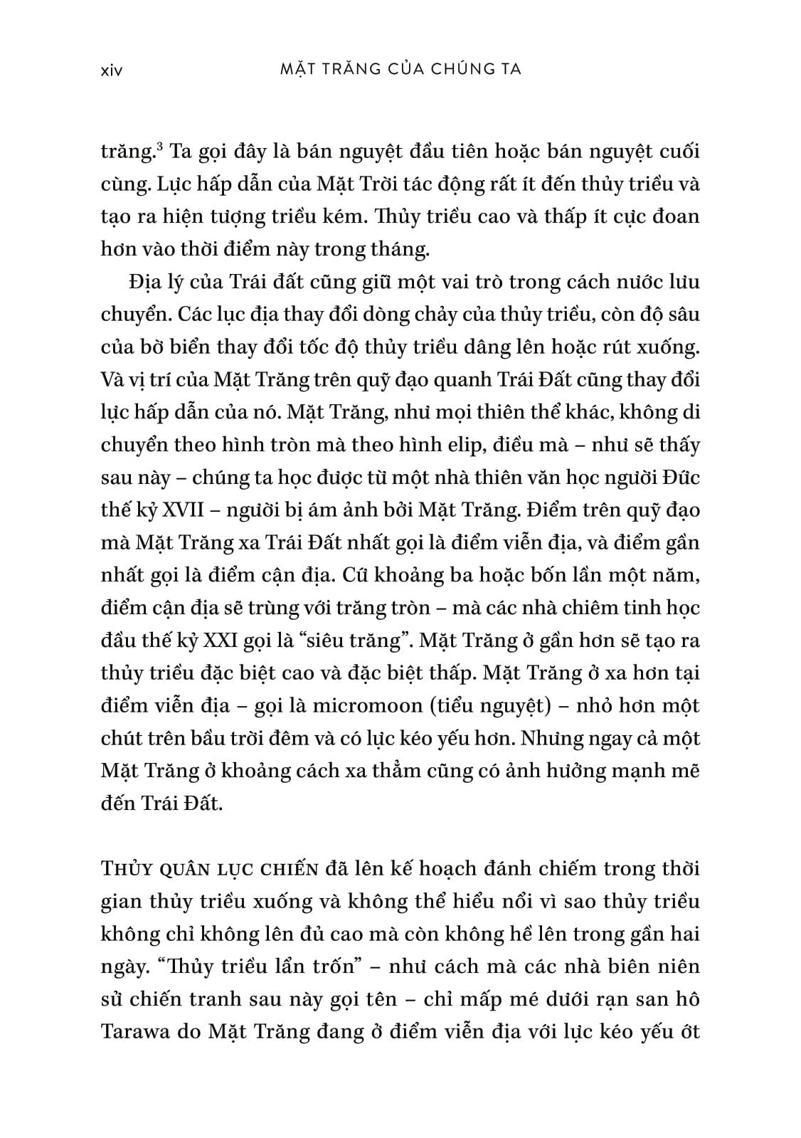 Lực hấp dẫn của Mặt Trăng đã ổn định quỹ đạo và khí hậu của Trái Đất. Nó kéo chất dinh dưỡng lên bề mặt của đại dương nguyên thủy, nơi nuôi dưỡng sự tiến hóa của sự sống phức tạp. Mặt Trăng tiếp tục ảnh hưởng đến di cư và sinh sản của động vật, sự sinh trưởng của thực vật và có thể cả dòng chảy của chính máu trong tĩnh mạch của chúng ta.