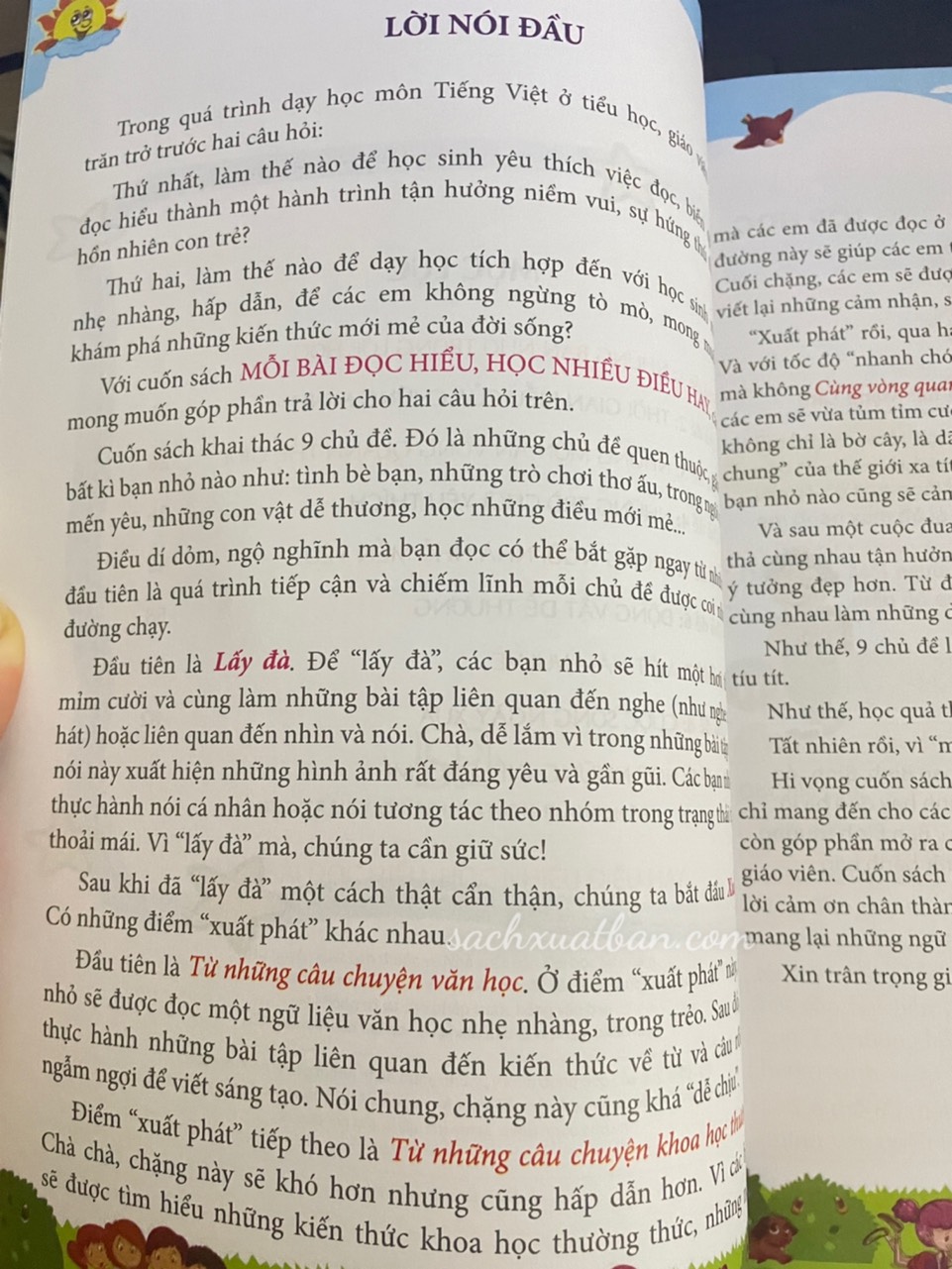 Đầu tiên là Từ những câu chuyện văn học. Ở điểm "xuất phát" này, các bạn nhỏ sẽ được đọc một ngữ liệu văn học nhẹ nhàng, trong trẻo. Sau đó, các em thực hành những bài tập liên quan đến kiến thức về từ và câu rồi có thể ngẫm ngợi để viết sáng tạo. Nói chung, chặng này cũng khá "dễ chịu".