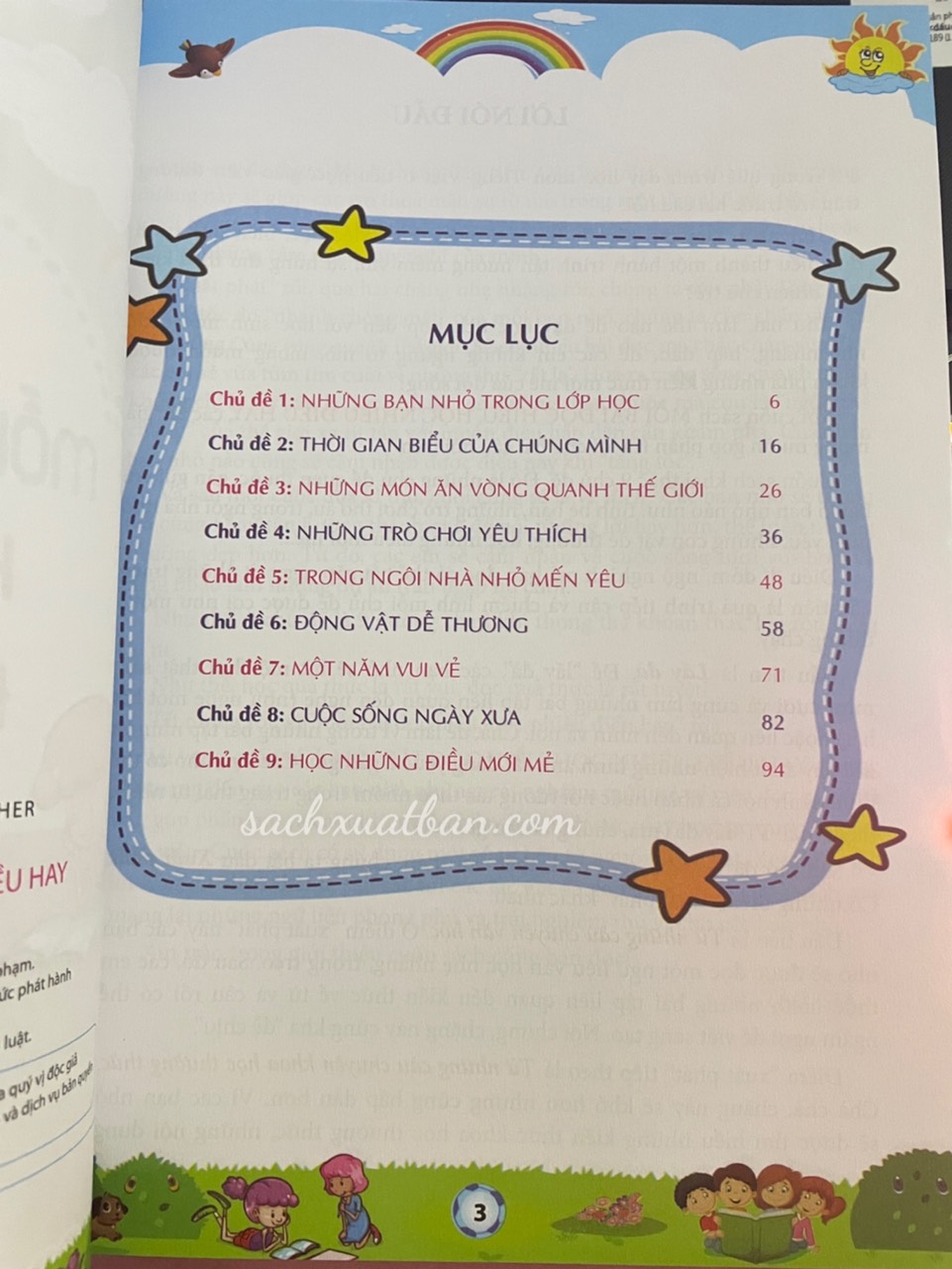 Cuốn sách khai thác 9 chủ đề. Đó là những chủ đề quen thuộc, gần gũi với bất kì bạn nhỏ nào như: tình bè bạn, những trò chơi thơ ấu, trong ngôi nhà nhỏ mến yêu, những con vật dễ thương, học những điều mới mẻ