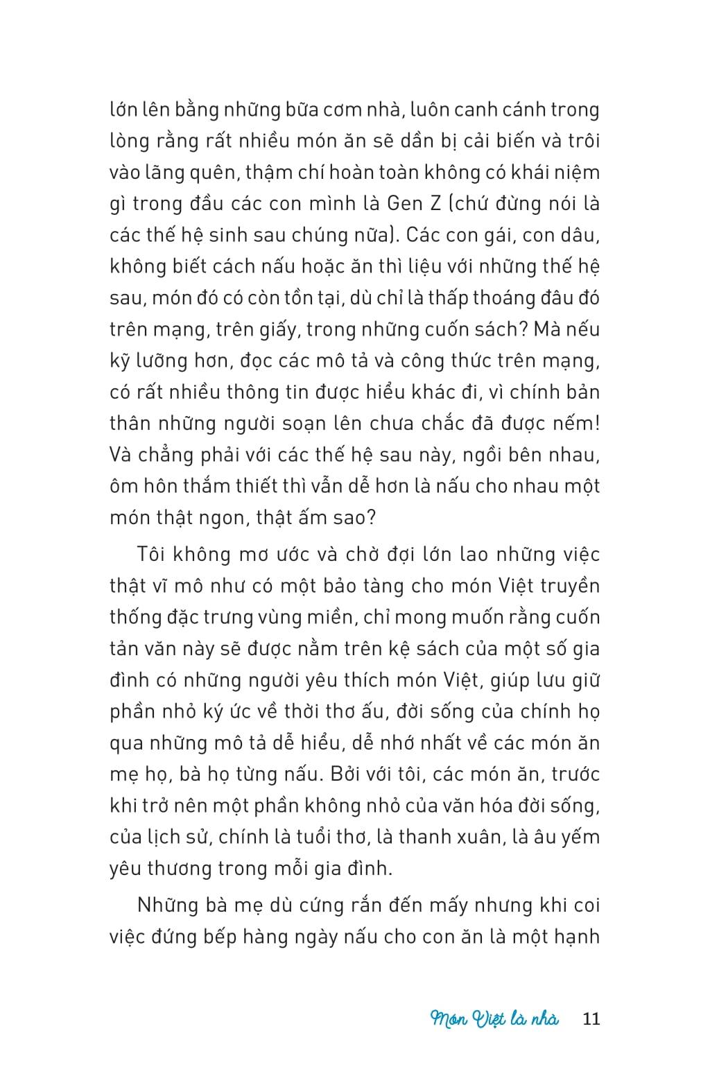 Rất nhiều người Việt khi thấy một món Việt được bưng lên đã reo lên ôi đây là món m.ình rất thích mà lâu quá không được ăn, chứ không hỏi nấu món này khó không. Lại nhiều người ngạc nhiên ngay lần đầu được nếm một món đã thấy hương vị sao quen quá, rồi nhận ra món ấy thực ra được gọi bằng một cái tên khác của món được bà, được mẹ, được chị hay bà vú nhà m.ình đã từng nấu… từ lâu. Chắc chắn, vào những lúc ấy, người nấu sẽ thấy vô cùng ấm áp trong lòng. Niềm vui không phải chỉ vì được ngợi khen nấu ngon nấu khéo, mà nhờ những trìu mến biết ơn vì như giúp thực khách bất ngờ gặp lại một người thân quen cũ đã xa nhau nhiều năm, như cùng họ chạm vào ký ức của biết bao chăm sóc gần gũi, âu yếm tưởng chừng đã quên nhưng hóa ra vẫn nằm sâu trong một vùng được gọi là ký ức.