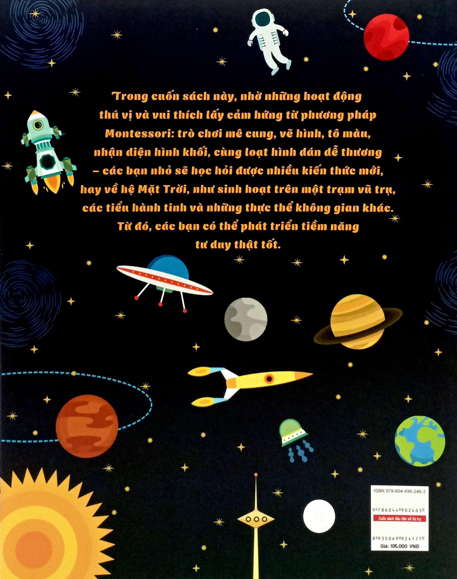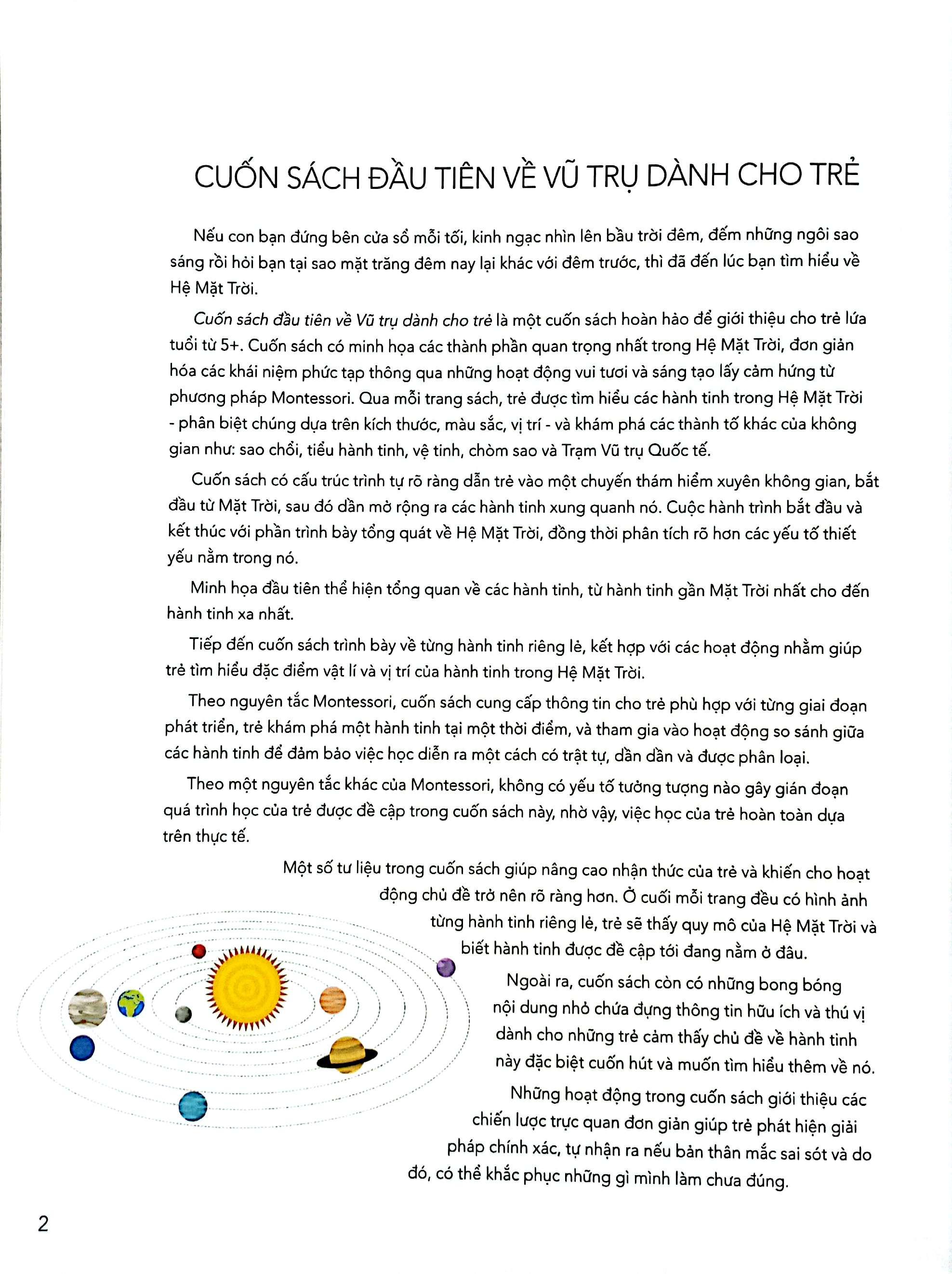 Cuốn sách đầu tiên về Vũ trụ dành cho trẻ là một cuốn sách hoàn hảo để giới thiệu cho trẻ lứa tuổi từ 5+. Cuốn sách có minh họa các thành phần quan trọng nhất trong Hệ Mặt Trời, đơn giản hóa các khái niệm phức tạp thông qua những hoạt động vui tươi và sáng tạo lấy cảm hứng từ phương pháp Montessori. Qua mỗi trang sách, trẻ được tìm hiểu các hành tinh trong Hệ Mặt Trời - phân biệt chúng dựa trên kích thước, màu sắc, vị trí - và khám phá các thành tố khác của không gian như: sao chổi, tiểu hành tinh, vệ tinh, chòm sao và Trạm Vũ trụ Quốc tế.