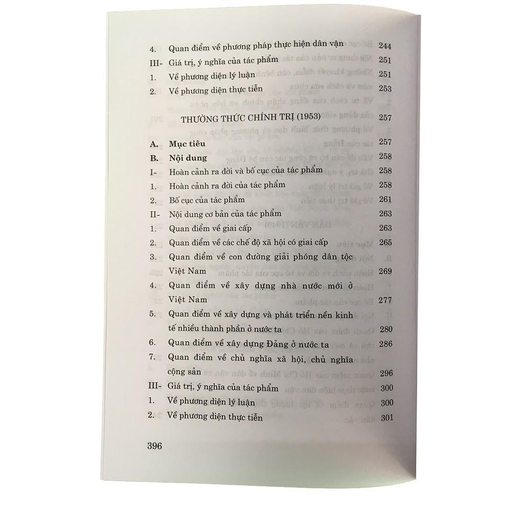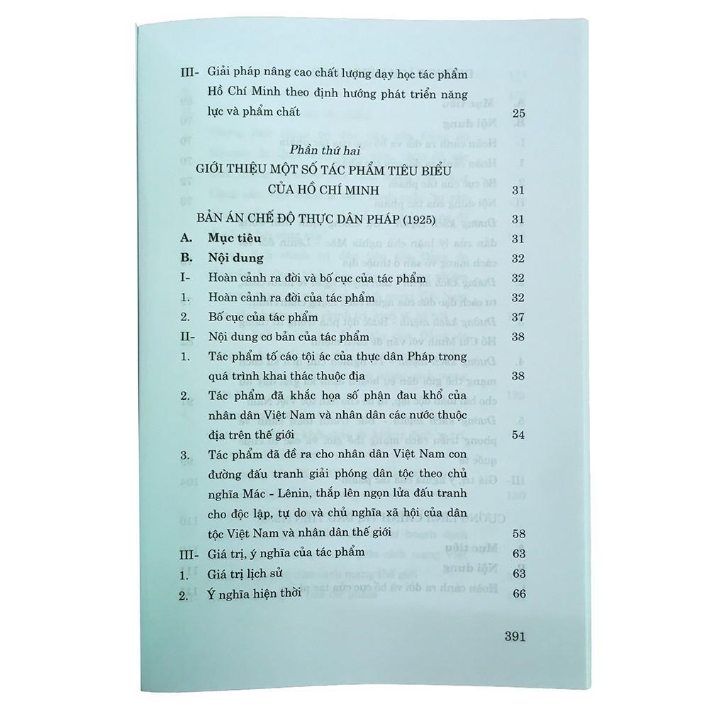 Nội dung cuốn sách gồm hai phần: Phần thứ nhất nêu một số vấn đề lý luận chung về dạy học tác phẩm Hồ Chí Minh; Phần thứ hai giới thiệu một số tác phẩm tiêu biểu của Hồ Chí Minh (như: Bản án chế độ thực dân Pháp, Đường kách mệnh, Cương lĩnh chính trị đầu tiên, Tuyên ngôn độc lập...). Trong mỗi tác phẩm, các tác giả xác định mục tiêu dạy học tác phẩm (năng lực, phẩm chất), hoàn cảnh ra đời và bố cục của tác phẩm, nội dung cơ bản của tác phẩm, giá trị của tác phẩm và một số câu hỏi ôn tập, củng cố...
