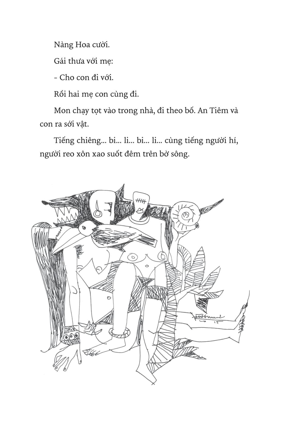“Vua Hùng nắm lấy tay An Tiêm đưa lên thềm bè. Rồi lại ra dắt tay từng người vào ngồi chiếu miến trải trong rạp. Bốn phía chen chúc những cánh thuyền hân hoan lướt đến xem mặt cả nhà An Tiêm, cùng lúc chiêng rền dậy mặt nước…”