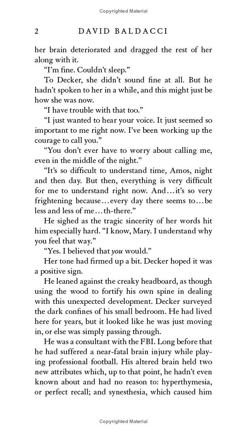 When Amos Decker is called to South Florida to investigate a double homicide, the case appears straightforward: A federal judge and her bodyguard have been found dead, the judge’s face sporting a blindfold with two eye holes crudely cut out, a clear sign that she’d made one too many enemies over her years on the bench.