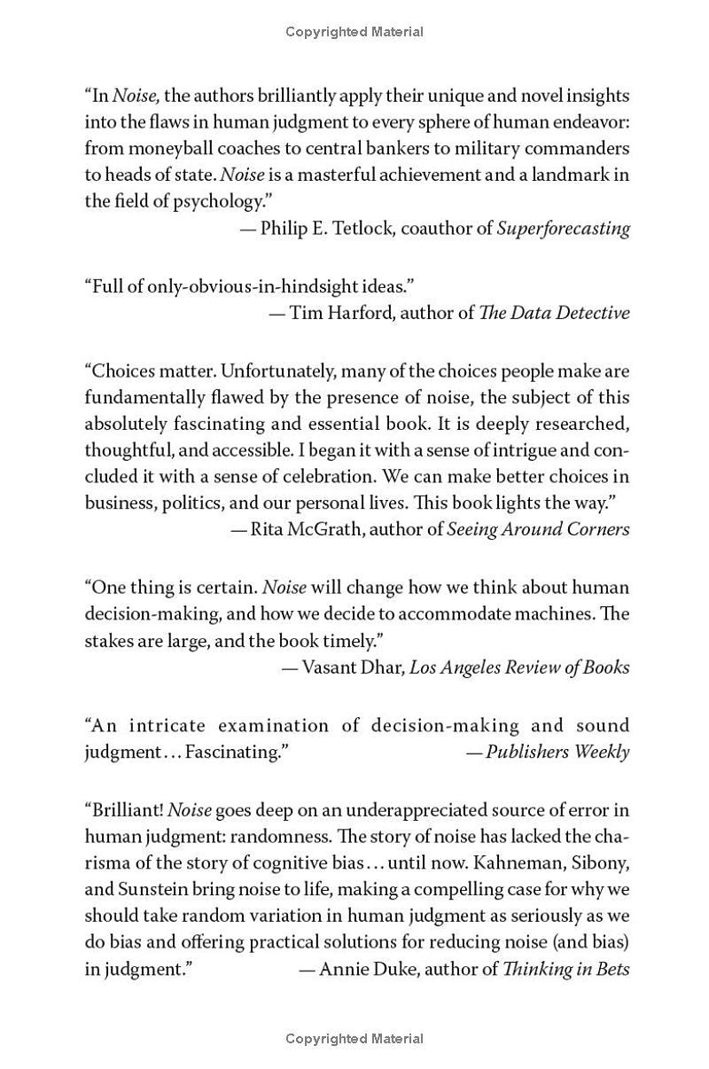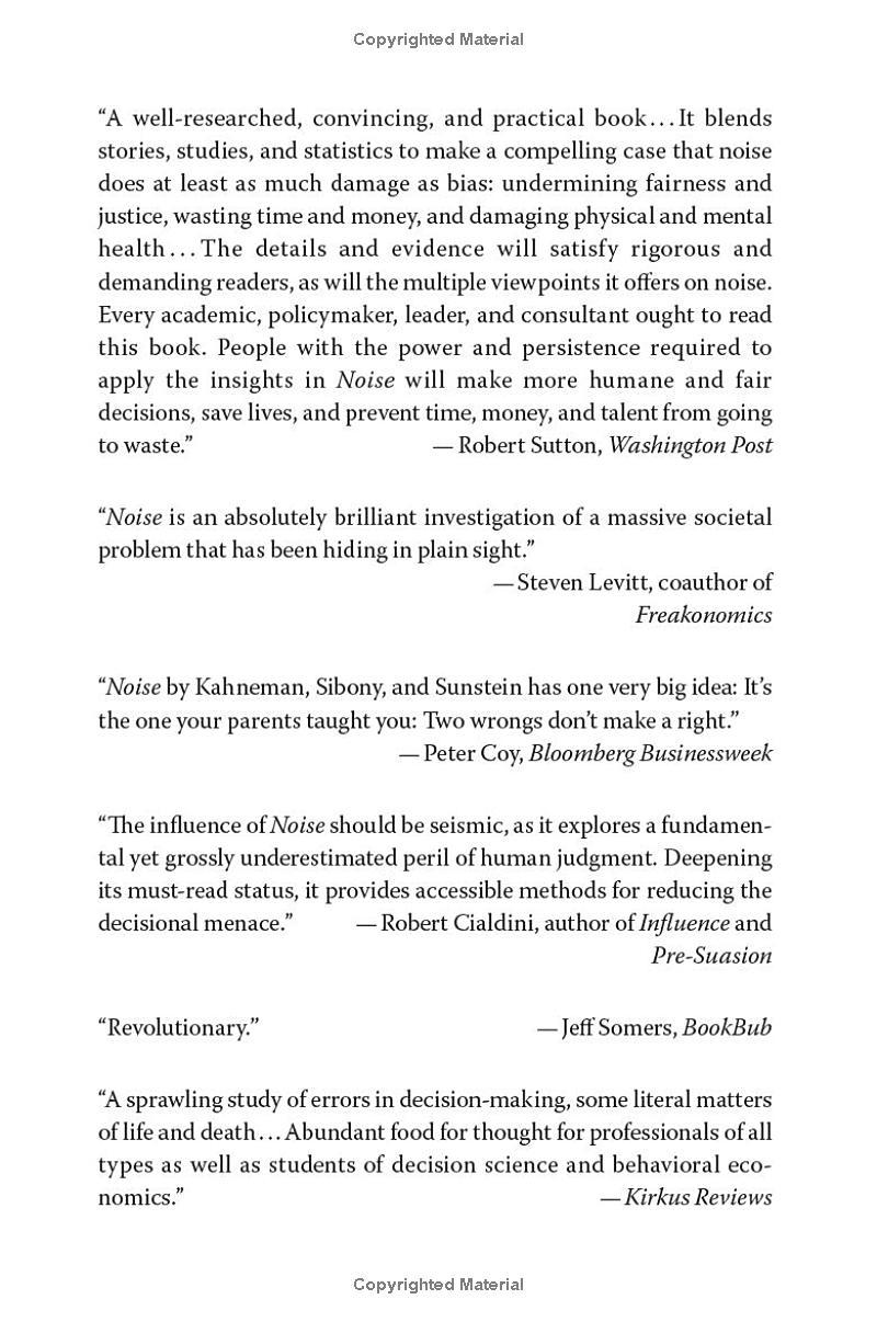 In Noise, Daniel Kahneman, Olivier Sibony, and Cass R. Sunstein show the detrimental effects of noise in many fields, including medicine, law, economic forecasting, forensic science, bail, child protection, strategy, performance reviews, and personnel selection. Wherever there is judgment, there is noise. Yet, most of the time, individuals and organizations alike are unaware of it. They neglect noise. With a few simple remedies, people can reduce both noise and bias, and so make far better decisions.